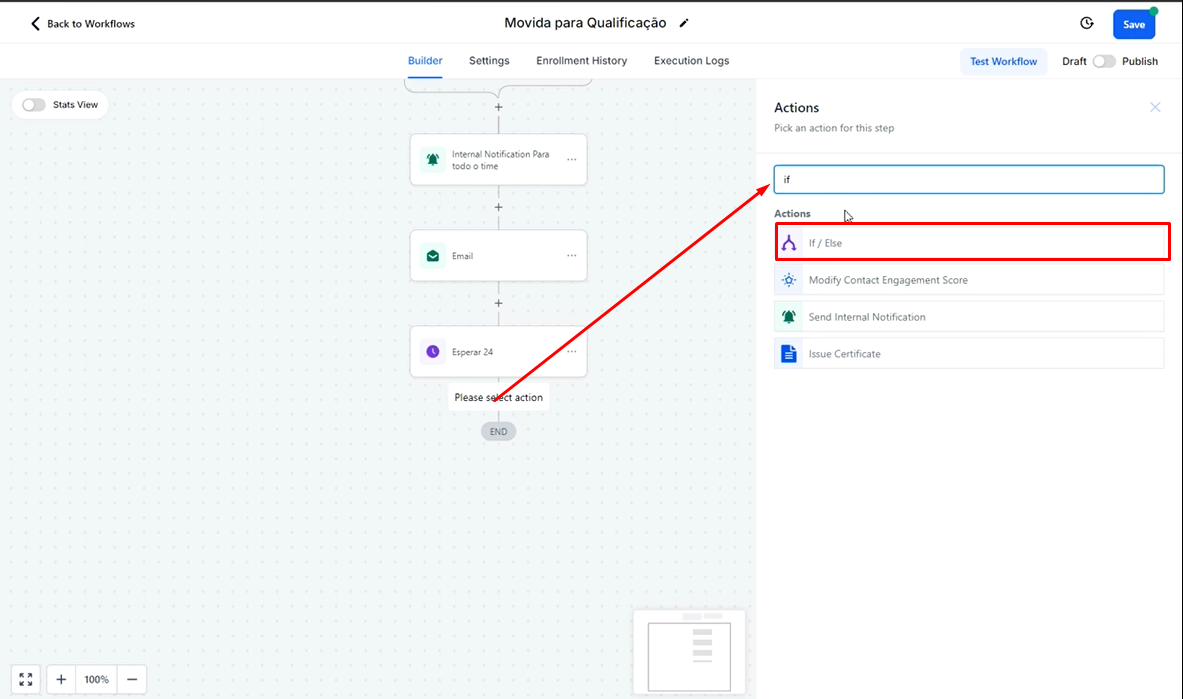 Na página de criação de fluxos, clique no "+" e escolha a ação "If/Else".