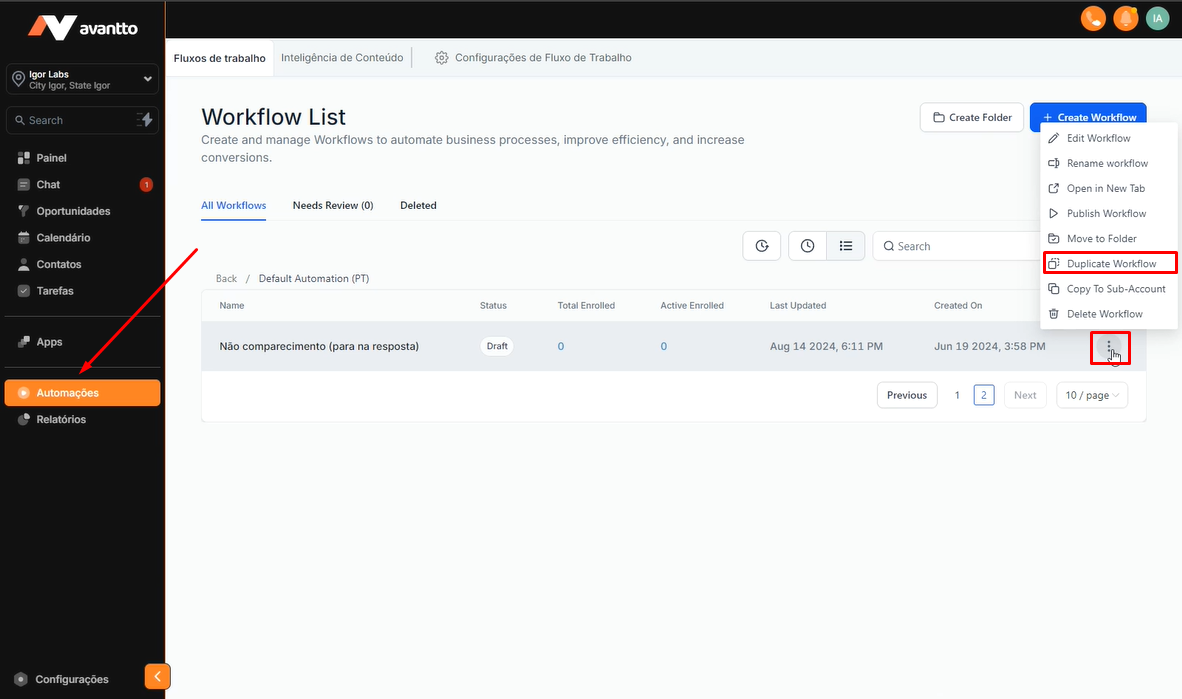 Clique nos três pontinhos ao lado da automação e, em seguida, selecione "Duplicate Workflow" para criar uma cópia da automação existente.