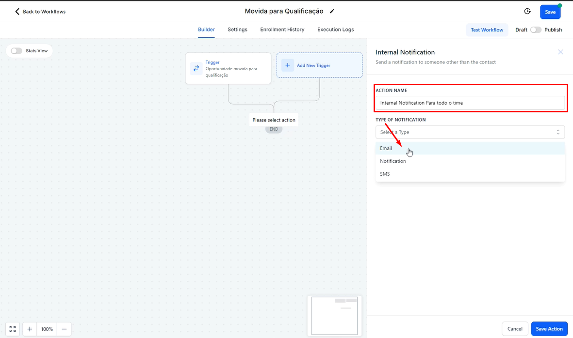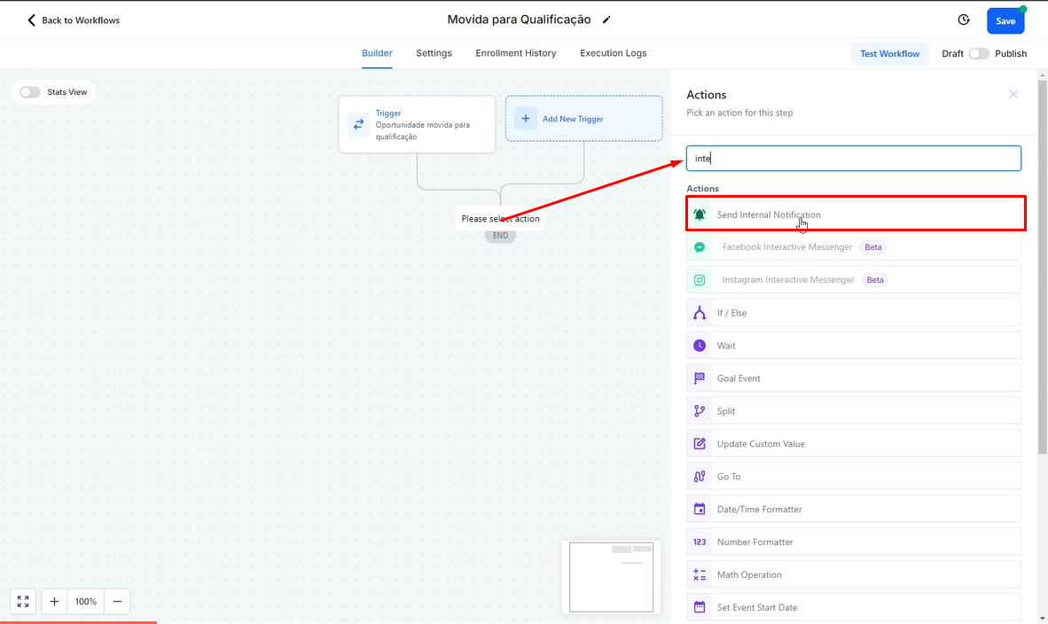 2.3 Após salvar as configurações, clique no "+" para adicionar uma ação. Para este exemplo enviaremos uma notificação interna para o time, avisando que a oportunidade foi movida de etapa, portanto você deverá escolher "Send Internal Notification".