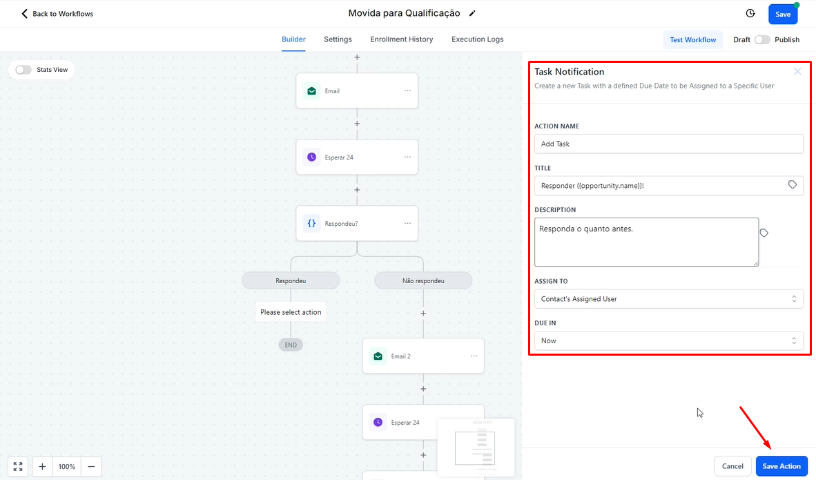 Se você quiser adicionar uma task caso a pessoa responda, clique no "+" abaixo de "Respondeu" e adicione uma ação "Add Task".