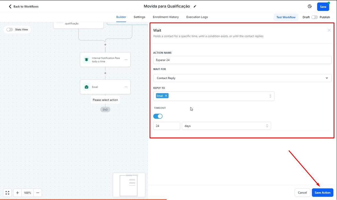 Em "Action Name", dê um nome a essa ação, como "Esperar 24h".