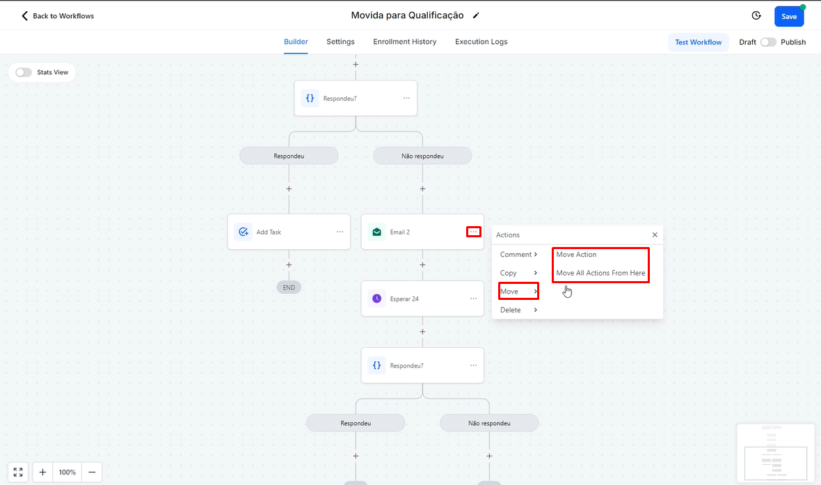 Para mover uma ação, clique nos três pontinhos ao lado da ação que deseja mover e, em seguida, a opção "Move" depois selecione "Move Action"