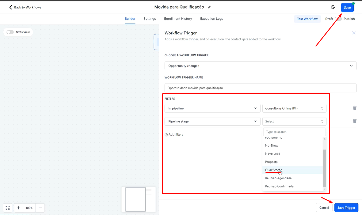 2.2 Nesta seção, você pode alterar o nome dessa ação específica do gatilho para facilitar a organização. Além disso, adicione os filtros necessários para definir quais oportunidades serão observadas.