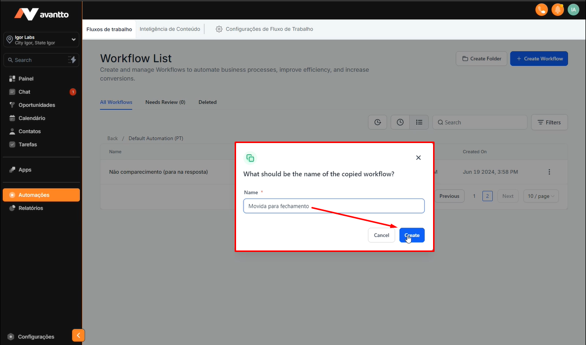 3.2 Renomeie essa automação de acordo com suas necessidades e clique em "Create/Criar".