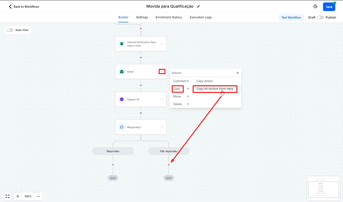 Para copiar, clique nos três pontinhos ao lado do e-mail que deseja duplicar, depois selecione "Copy" e, em seguida, escolha "Copy All Actions From Here".
