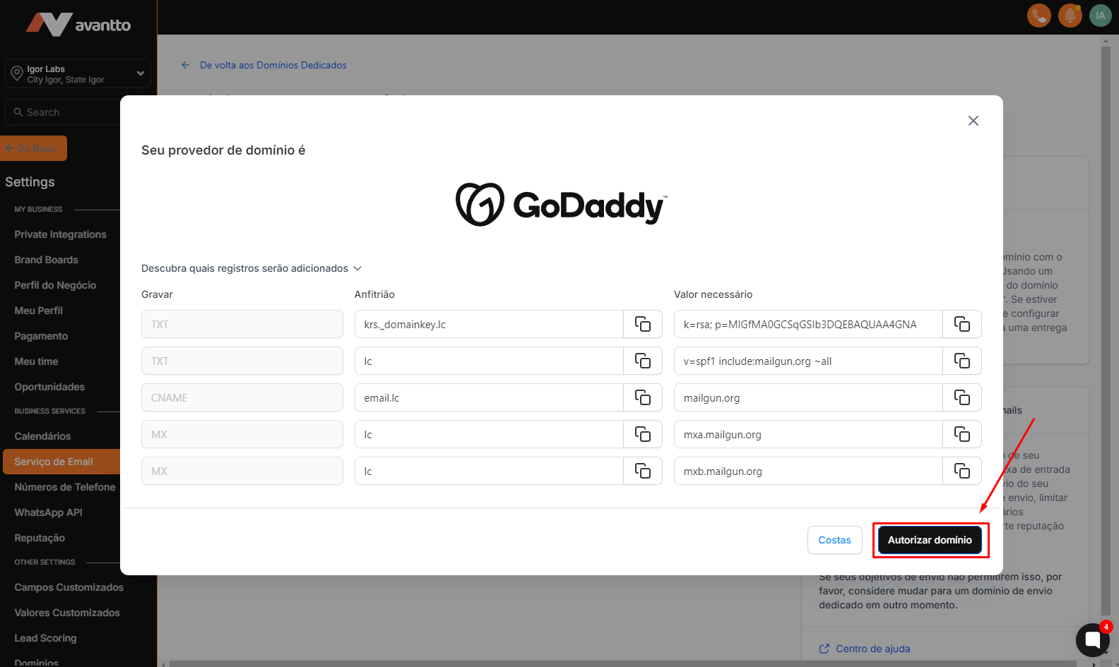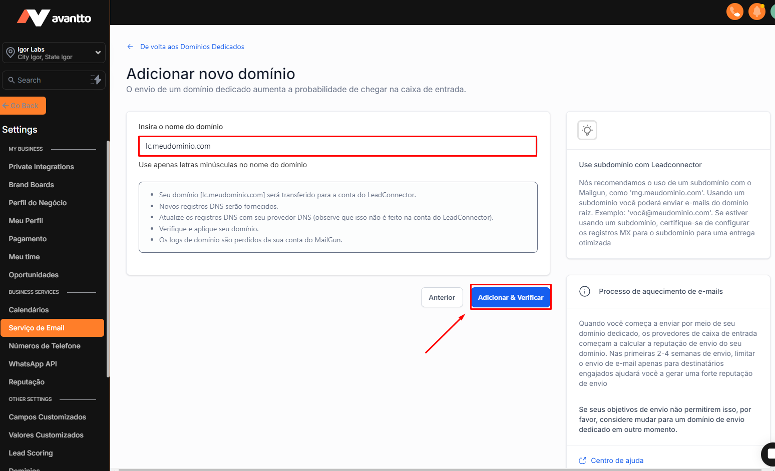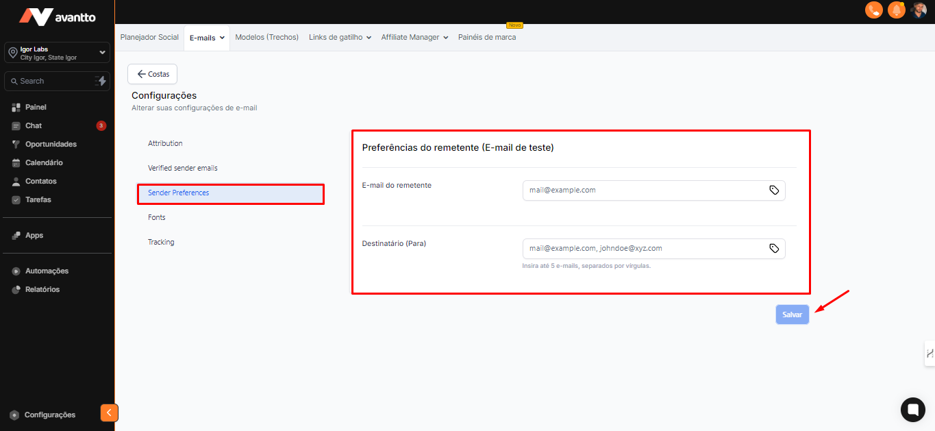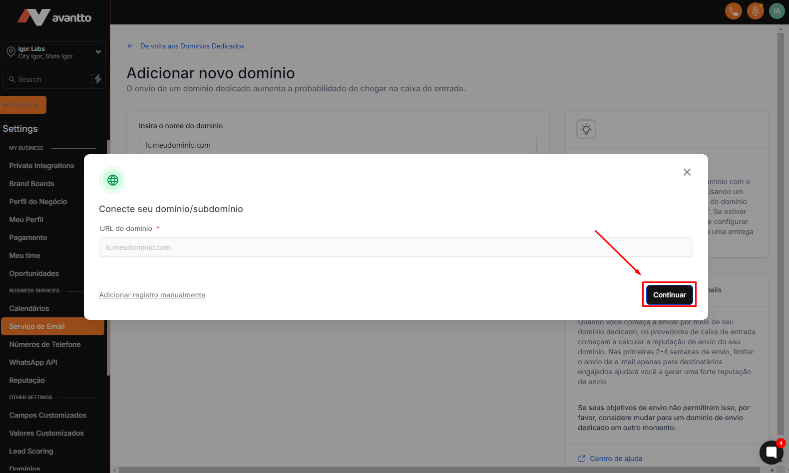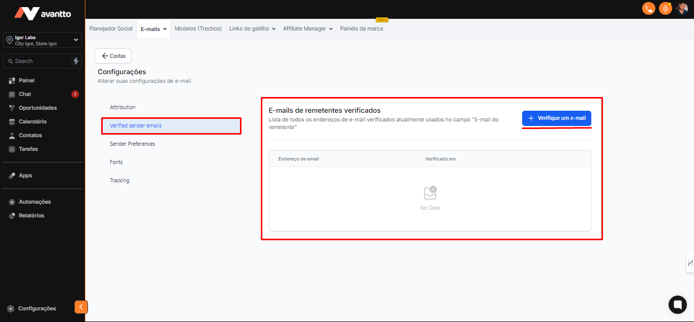 Recomenda-se usar o e-mail cadastrado na plataforma Avantto ou um e-mail do seu próprio domínio. Por exemplo, você pode usar um e-mail do Hotmail, mesmo que não esteja configurado dentro do Avantto, desde que seja um domínio validado.