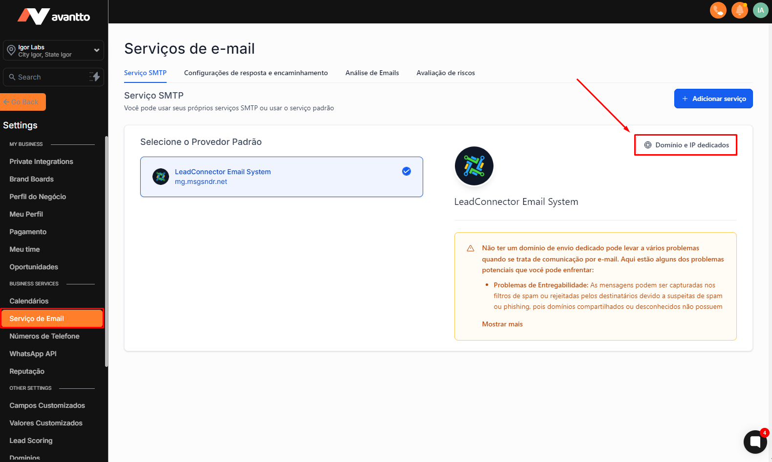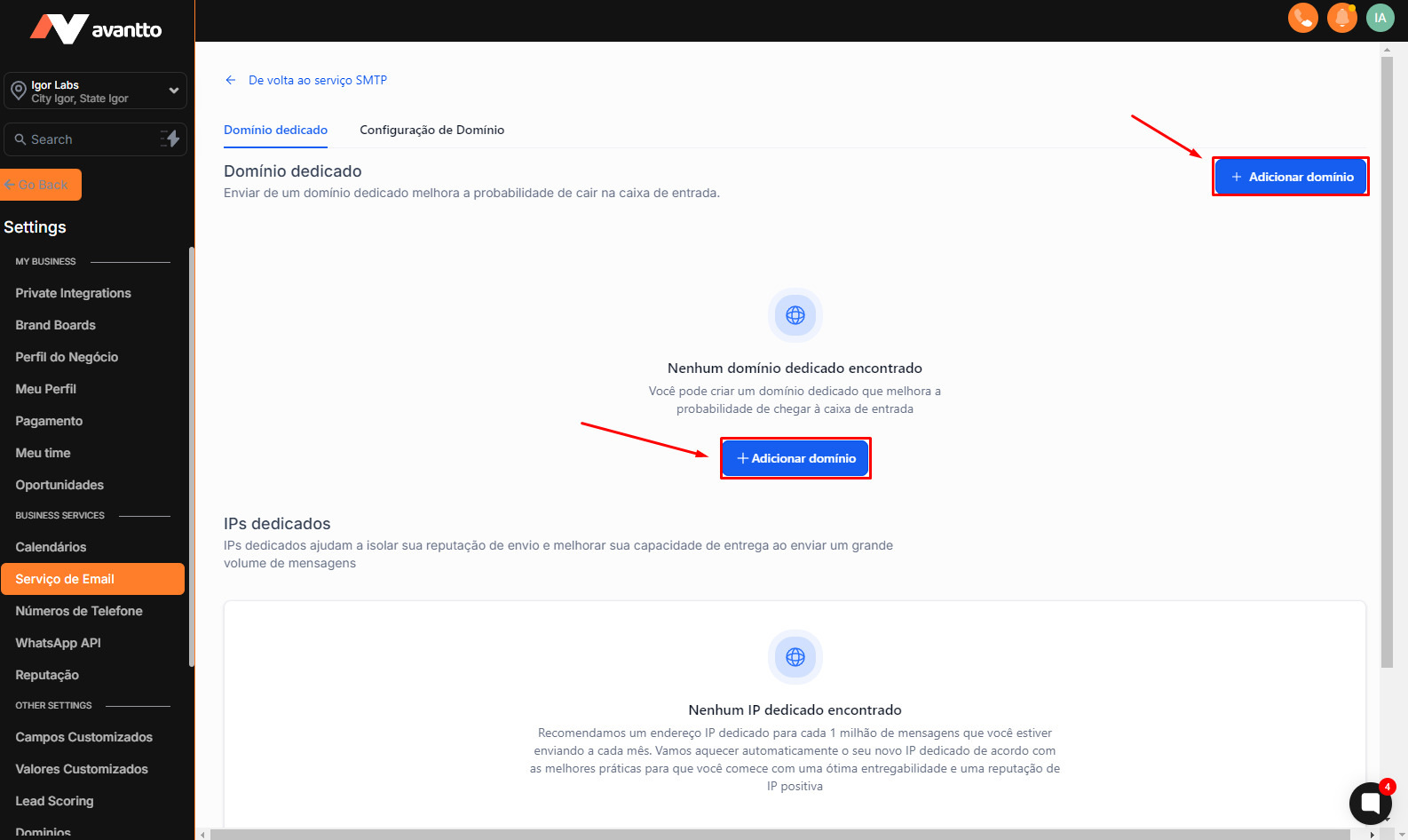 Para fazer isso, ainda no menu lateral esquerdo, clique em "Domínio e IP dedicado" e depois selecione "Adicionar Serviço". Em seguida, escolha a opção correspondente à integração do seu domínio.