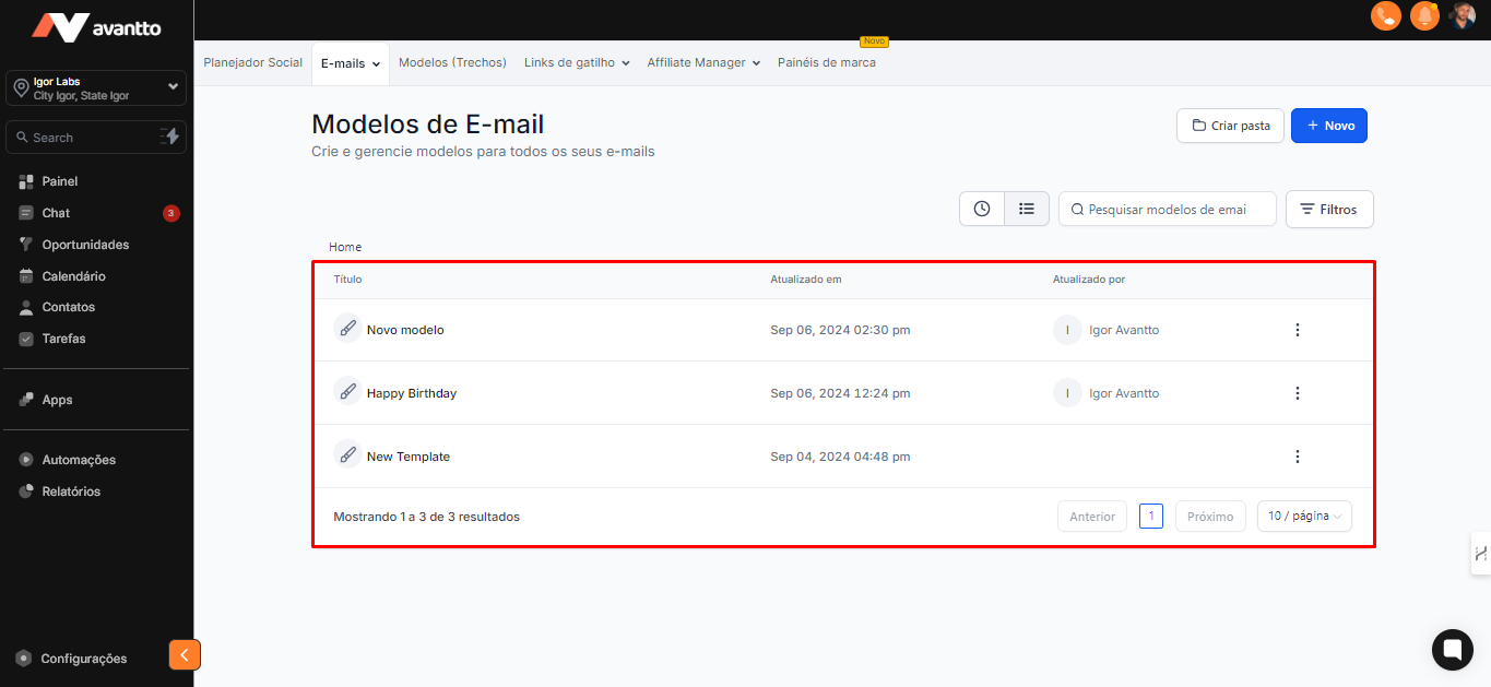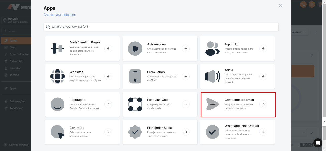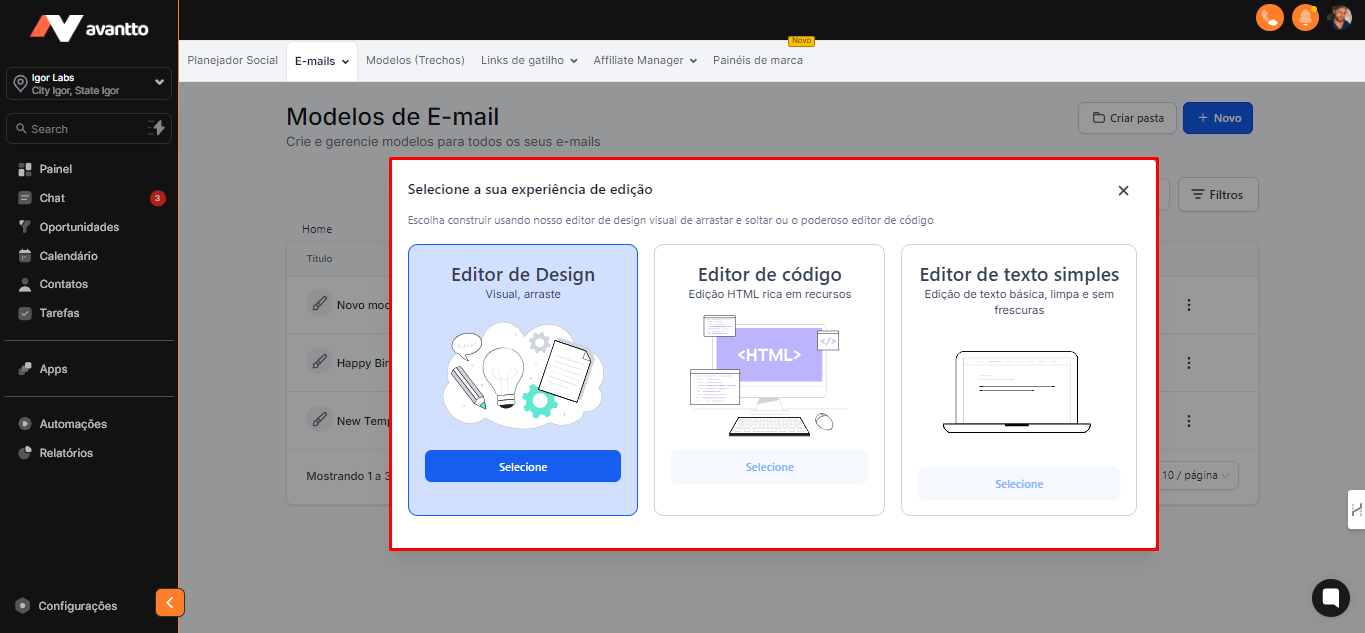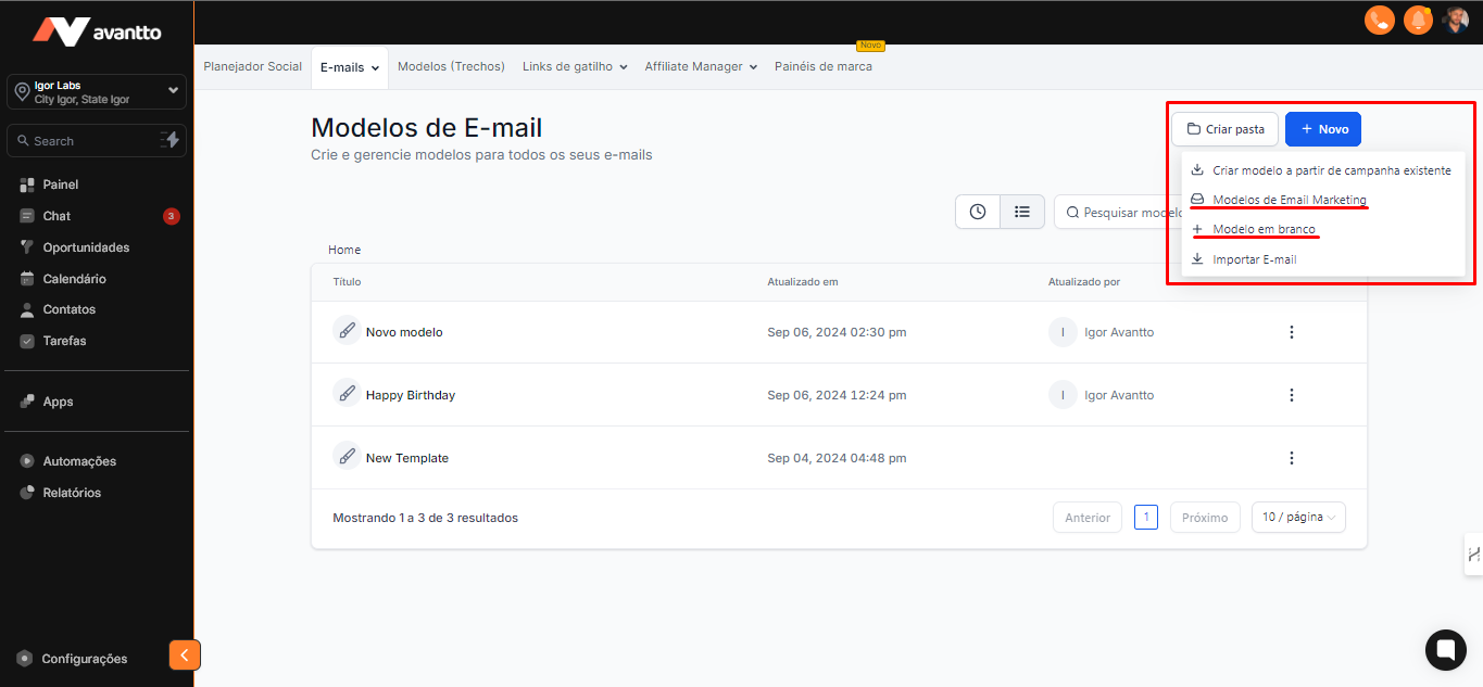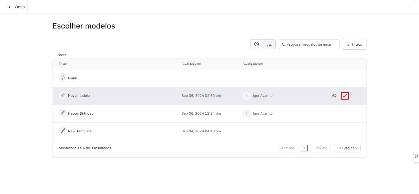 2.8 Clique em "Campanhas" e depois em "Novo", seguindo o mesmo procedimento do passo a passo "Modelo". Uma lista de todos os modelos criados será exibida; basta escolher qual modelo você deseja usar na campanha.