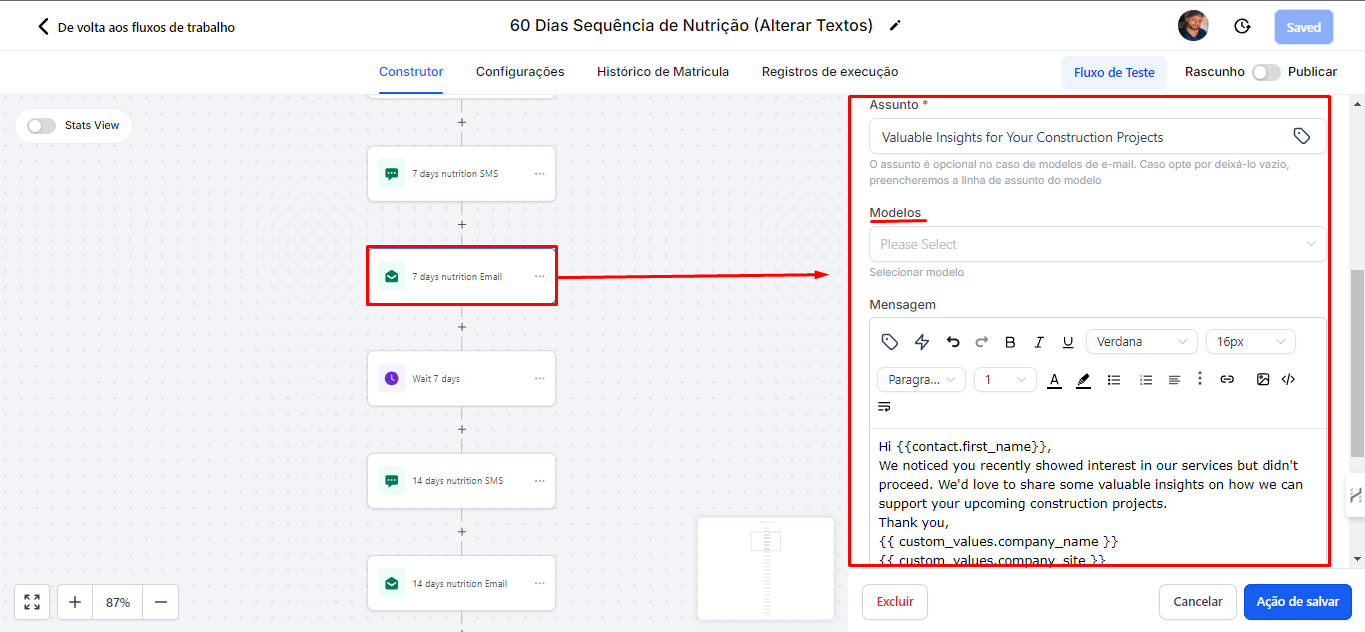 Já existe um fluxo de nutrição que combina mensagens e e-mails, mas nada impede que você crie um fluxo com múltiplos e-mails, personalizando a sequência de acordo com suas necessidades.