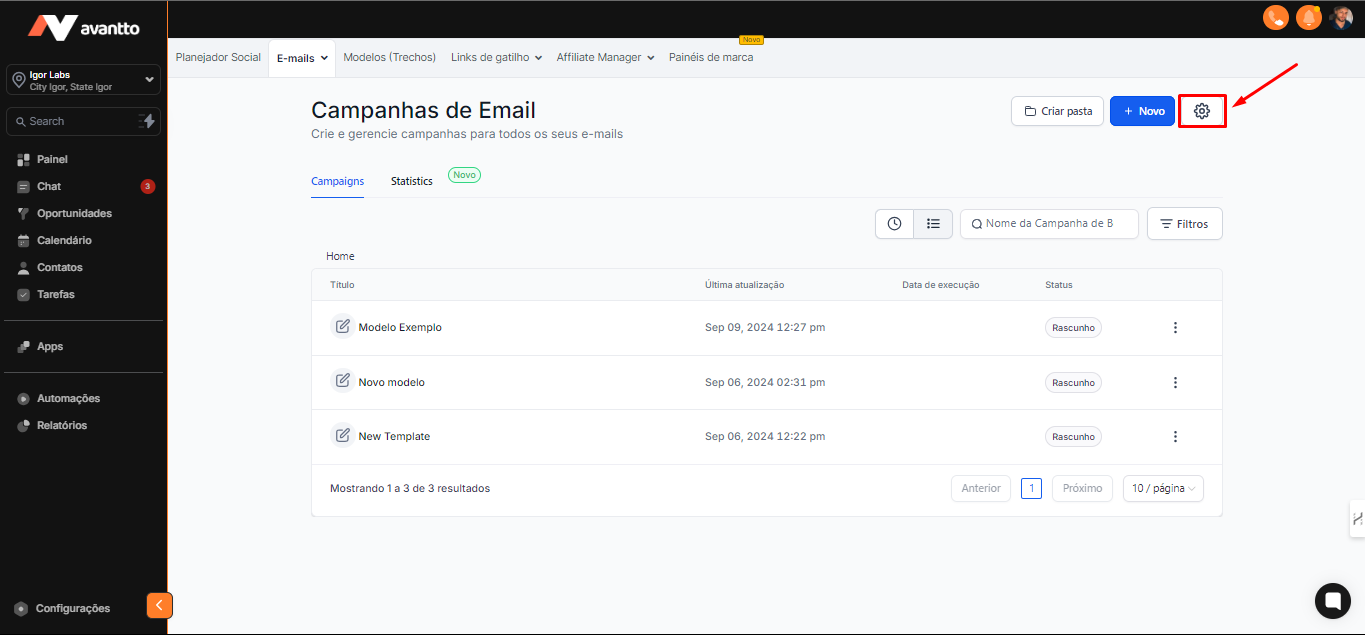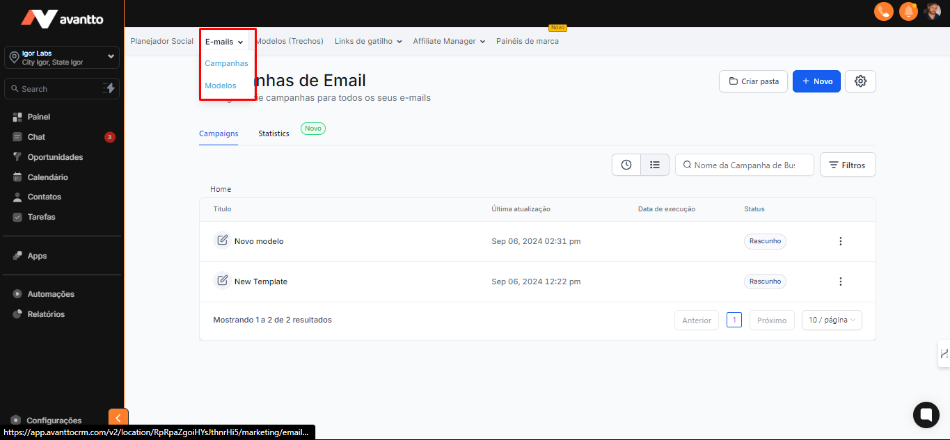 2.3 Localize o campo "Emails", que apresentará duas opções: "Campanhas" e "Modelos".