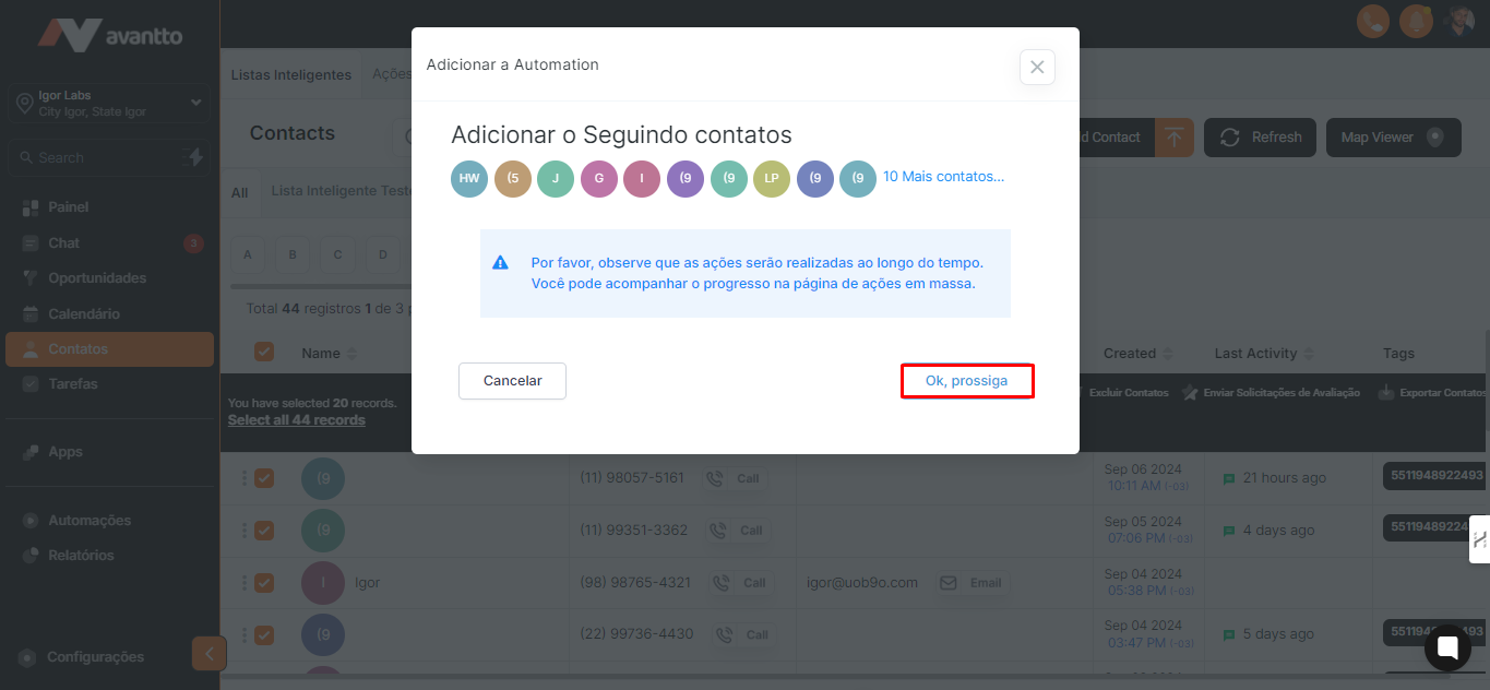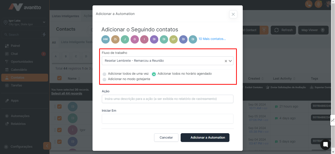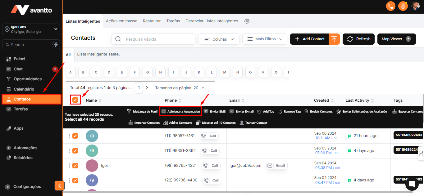 3.6 Para adicionar uma lista de contatos dentro desta automação e acionar a sequência de e-mails, volte ao menu do lado esquerdo da tela e clique em "Contatos", selecione as pessoas que deseja incluir ou escolha a opção de selecionar todos. Em seguida, adicione esses contatos à automação e vincule-os ao fluxo de e-mails que você criou.