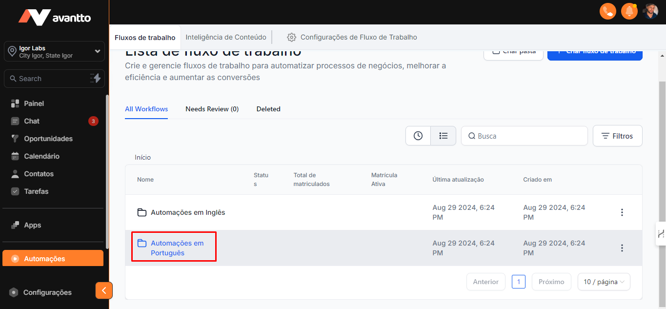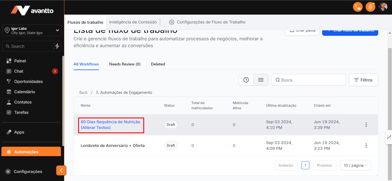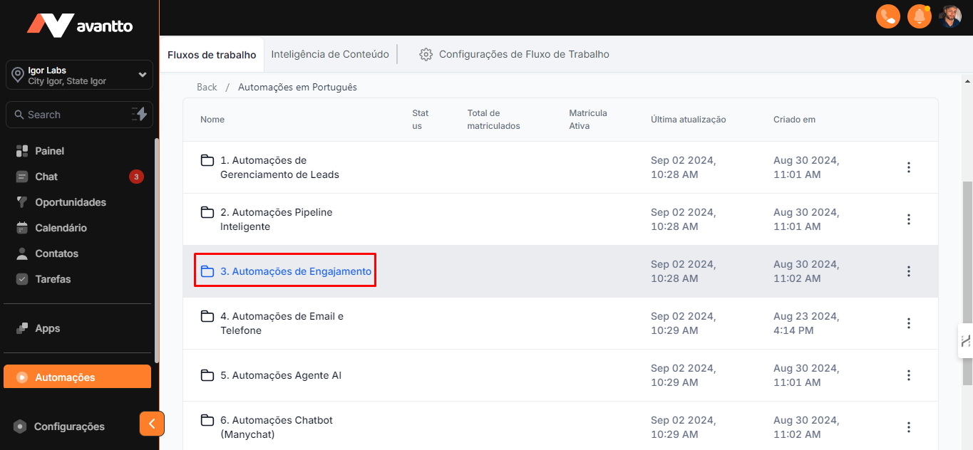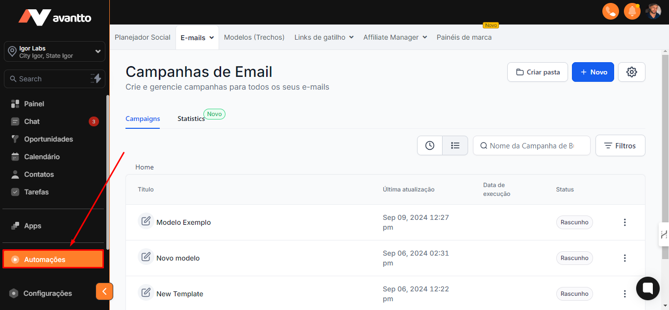 3.1 No menu do lado esquerdo da tela, clique em Automações