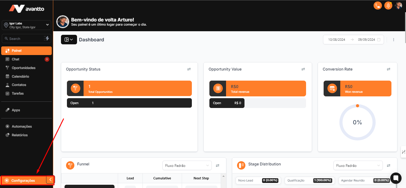 1.1 No menu do lado esquerdo da tela, clique em "Configurações"