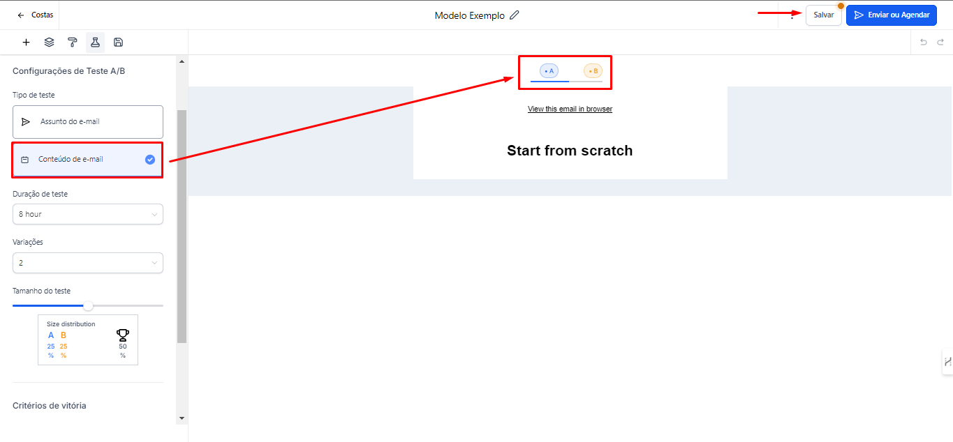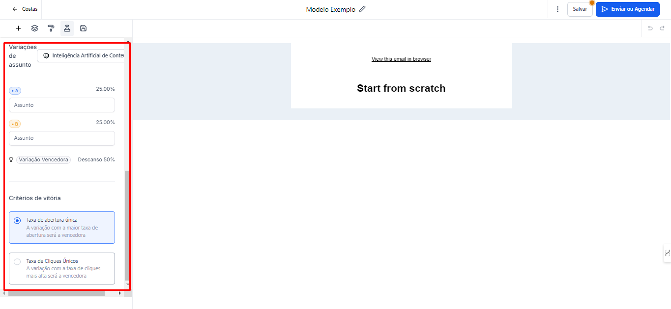 2.12 Para realizar o teste de assunto A/B, configure os dois assuntos que você deseja testar e defina os critérios de vitória, como taxa de abertura única ou taxa de clique única.
