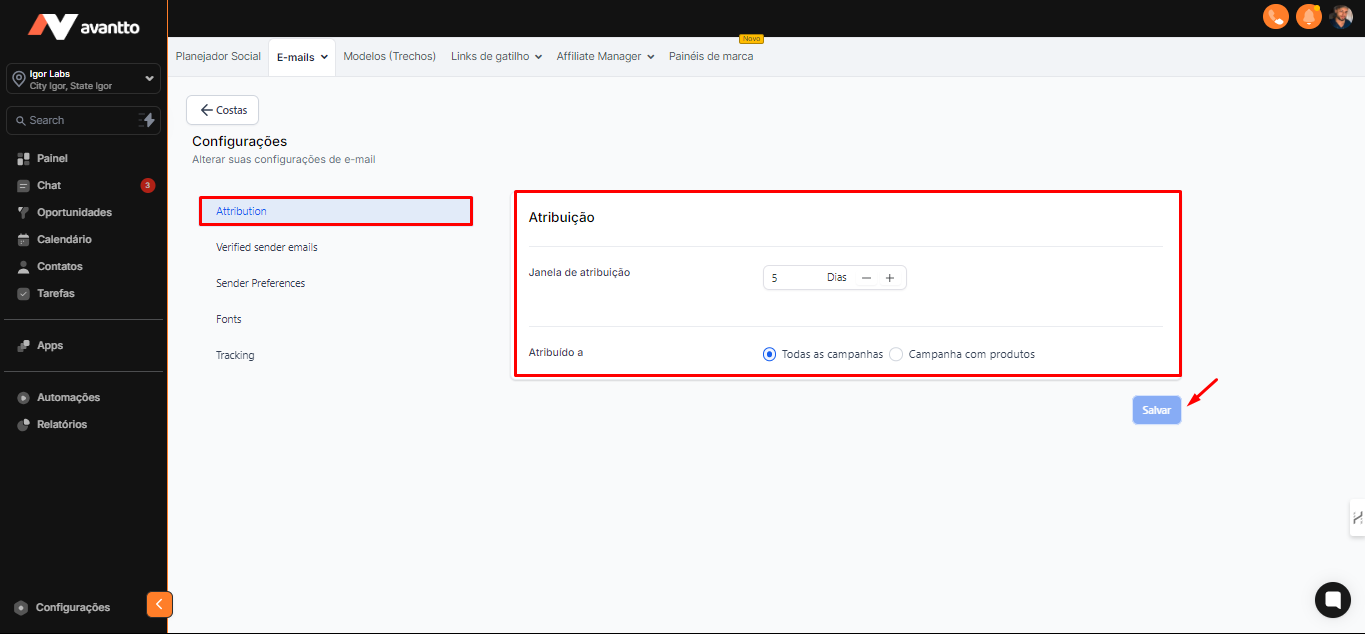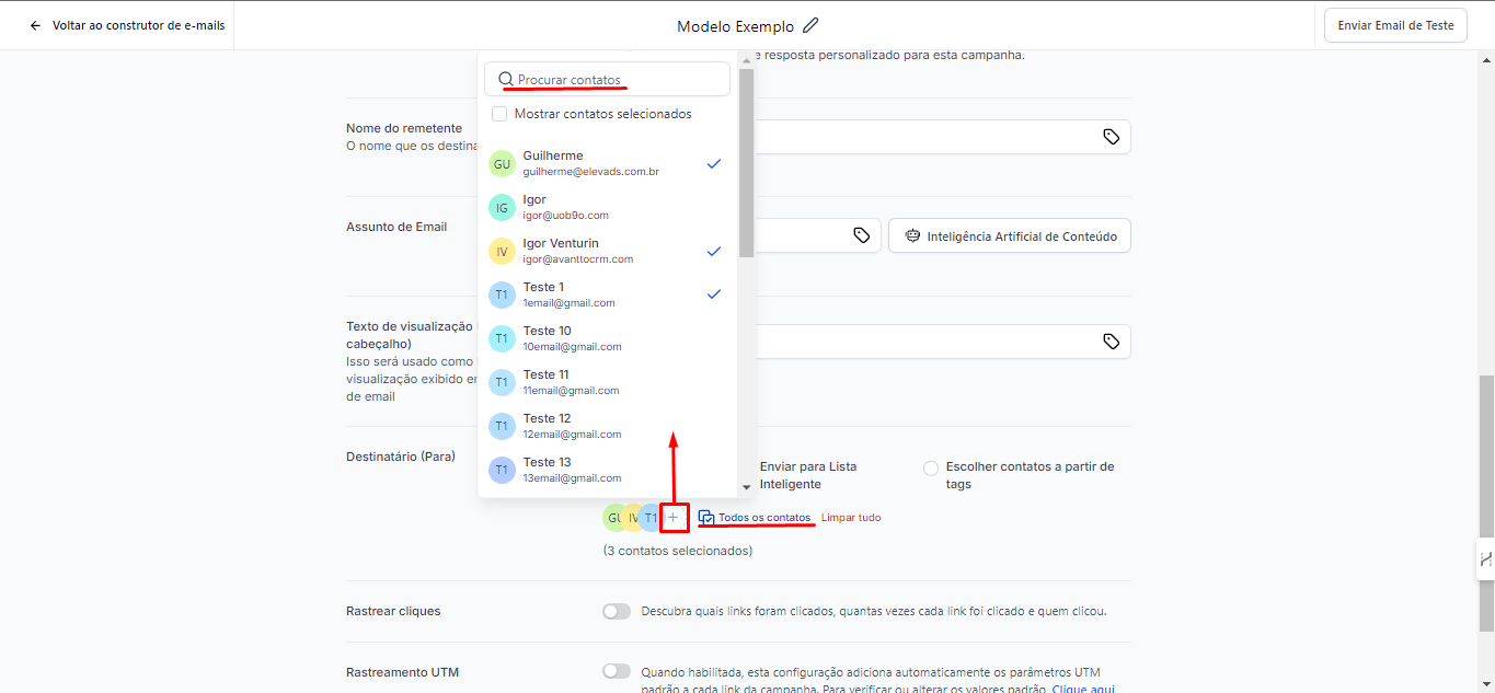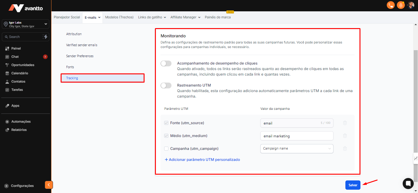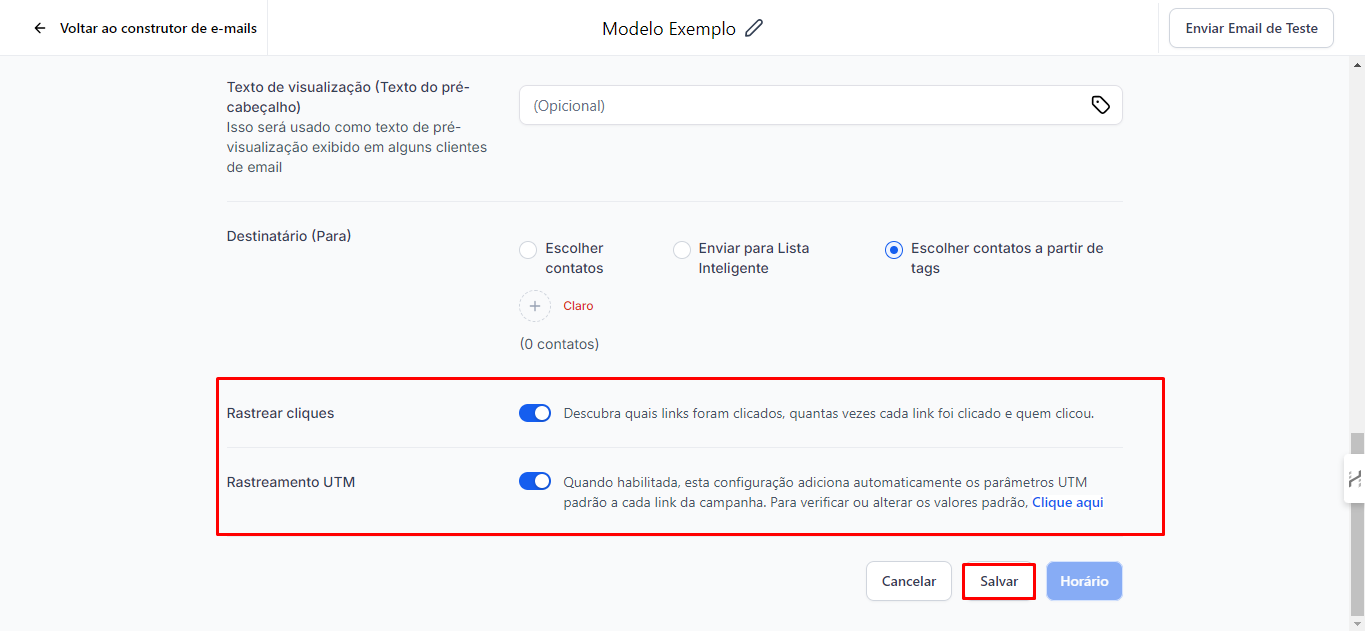 2.25 Recomenda-se que as opções de "Rastreamento de Cliques" e "Rastreamento UTM" estejam habilitadas. Elas são importantes para que você possa analisar quantas pessoas clicaram em determinados links dentro do e-mail e identificar de qual campanha cada contato veio, especialmente quando há várias campanhas em execução.