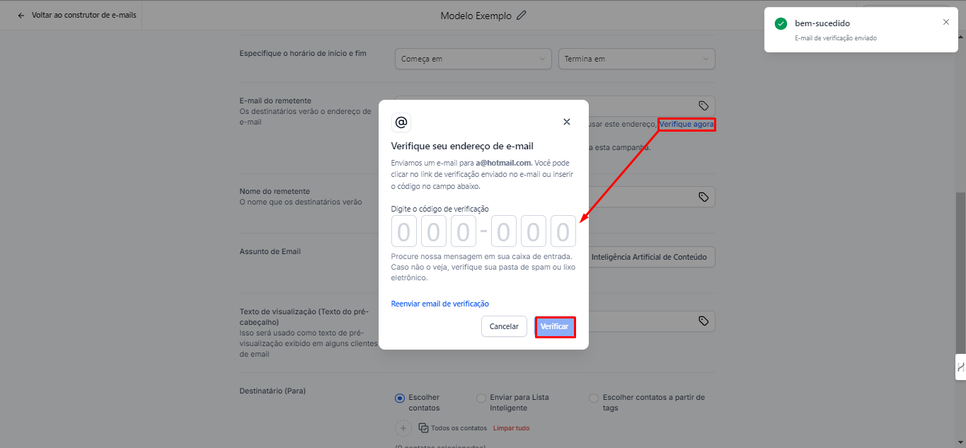 Para validar o e-mail, clique em "Verificar E-mail", insira o código recebido e, por fim, clique em "Verificar". Após esta etapa, o e-mail será liberado para uso.