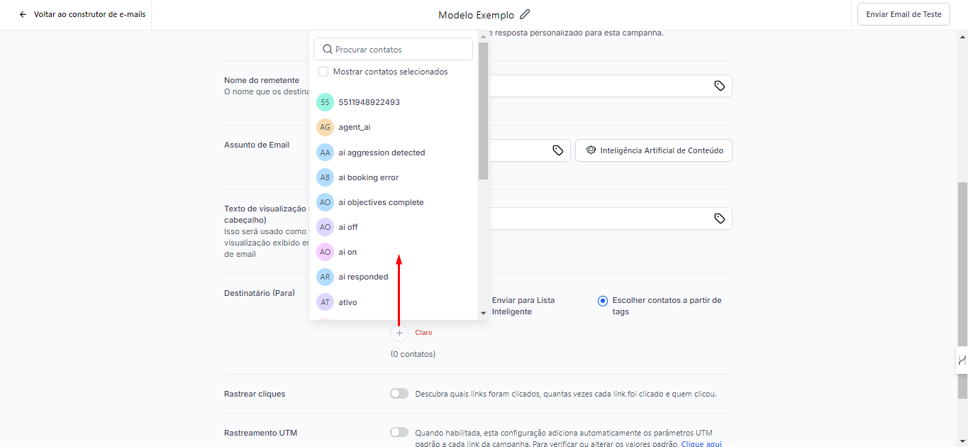 2.24 Escolha Contatos Baseados em Tags: Para selecionar contatos com base em tags, basta clicar no símbolo "+" e escolher as tags desejadas.