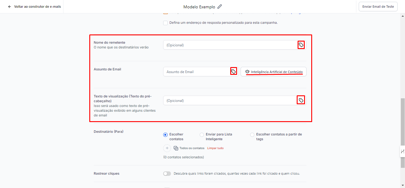 Texto de Pré-visualização: Este texto aparece abaixo do assunto como uma descrição do e-mail, geralmente em um formato menor. Esta opção é opcional, pois o sistema geralmente puxa as primeiras linhas do corpo do e-mail. No entanto, se preferir personalizar, basta escrever o texto desejado.