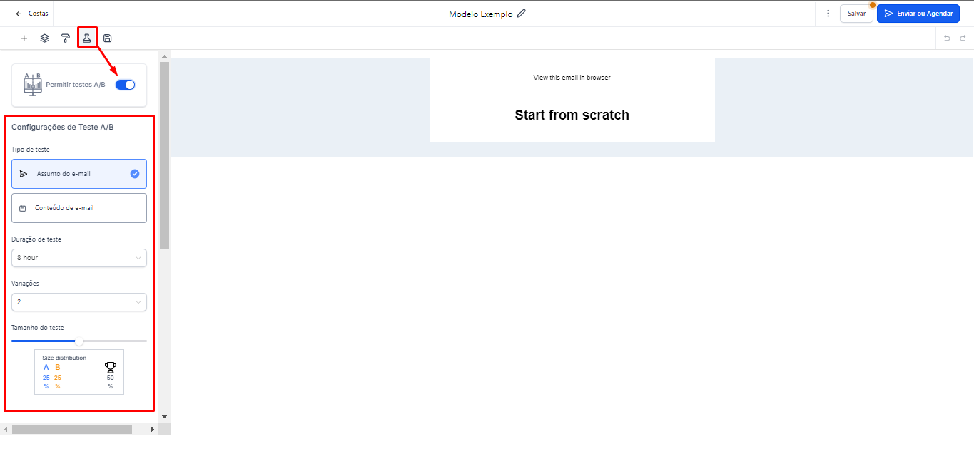 Ao clicar em "Teste A/B" e habilitar a opção "Permitir Testes A/B", você poderá escolher entre dois métodos de teste, através do assunto e através do corpo do e-mail. Você também poderá escolher a duração pela qual o teste permanecerá ativo. Por exemplo, se você enviar 100 e-mails, poderá analisar, nas próximas 8 horas, quantos serão abertos, quantos serão respondidos, entre outras métricas. Defina quantas variações você deseja testar e defina o tamanho do teste.