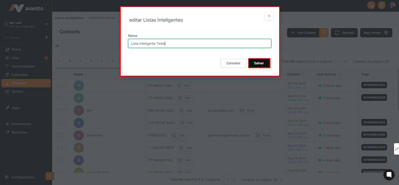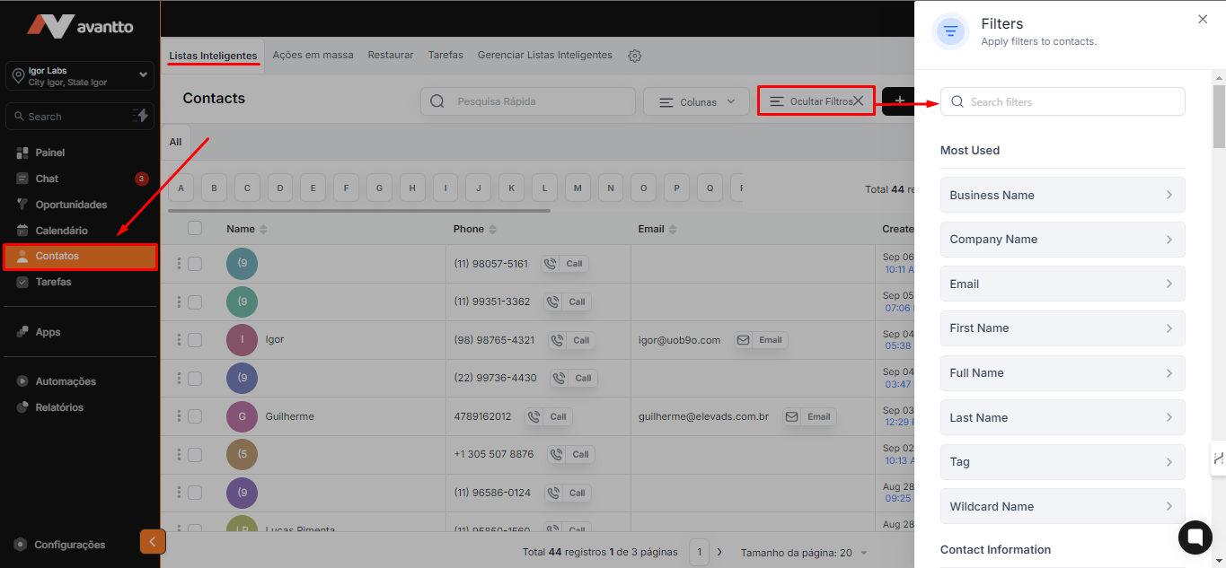 2.20 Para configurar e salvar listas inteligentes, clique no menu lateral esquerdo da tela em "Contatos."