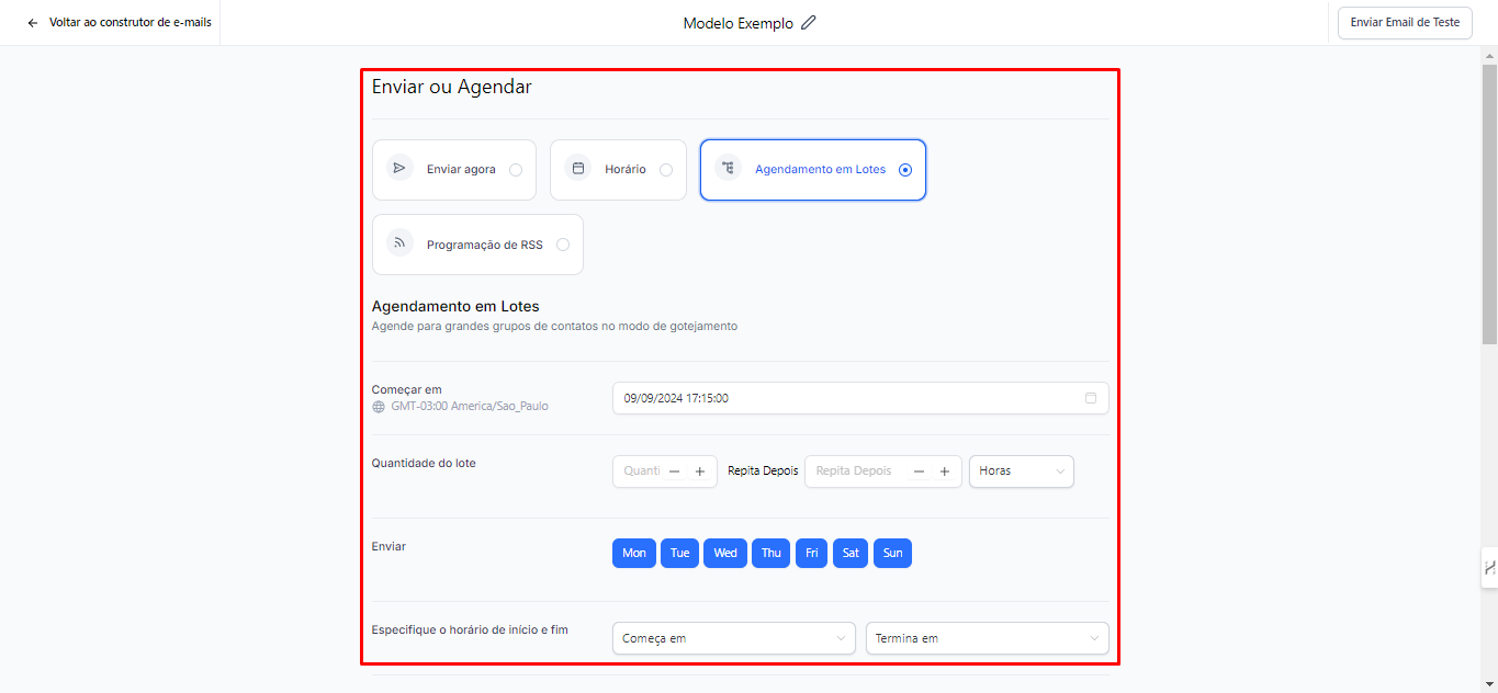 Agendamento em Lote: Você pode configurar o envio em intervalos, escolhendo o número de e-mails enviados em cada lote e definindo a frequência (em horas, dias, minutos ou segundos), bem como os dias da semana e horários de início e término.