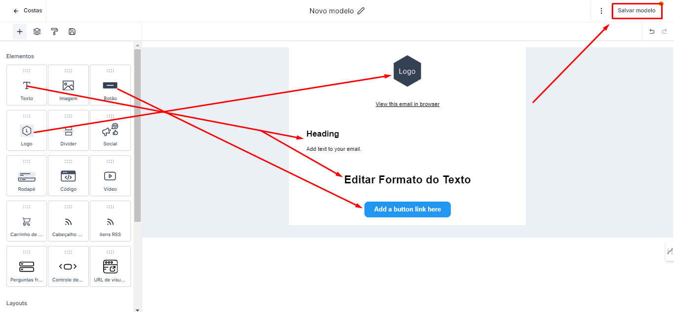 Editor de Design: Um construtor de e-mails intuitivo que utiliza a funcionalidade de arrastar e soltar, facilitando o processo de criação.
