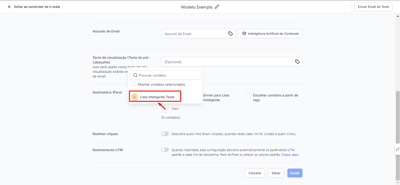 2.19 Enviar para Lista Inteligente: Para enviar sua campanha para uma lista inteligente, basta clicar no símbolo "+" e selecionar a lista que você criou anteriormente.