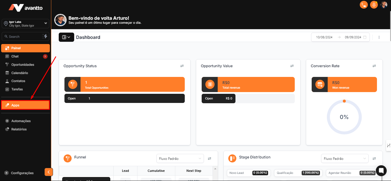 2.1 No menu lateral esquerdo da tela, clique em "Apps"