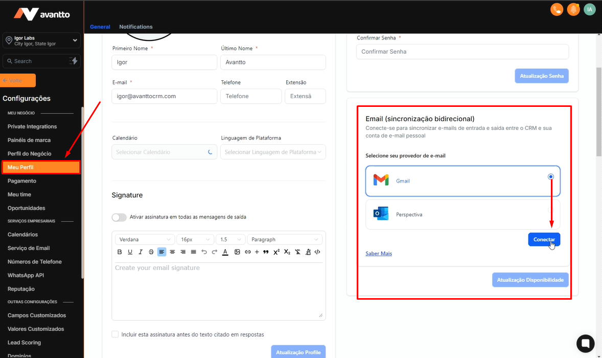 1.2 Clique em "Meu Perfil". Ao rolar para baixo, você encontrará o campo "E-mail (sincronização bidirecional)". Neste espaço, você pode realizar a sincronização nativa tanto para Gmail quanto para Hotmail.