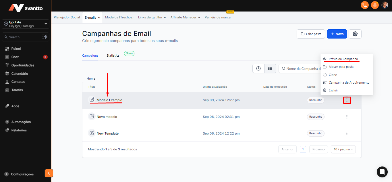 2.10 Na página de campanhas, você pode clicar nos três pontos ao lado da campanha escolhida para visualizar uma prévia. Se quiser alterar alguma informação, basta clicar diretamente na campanha.