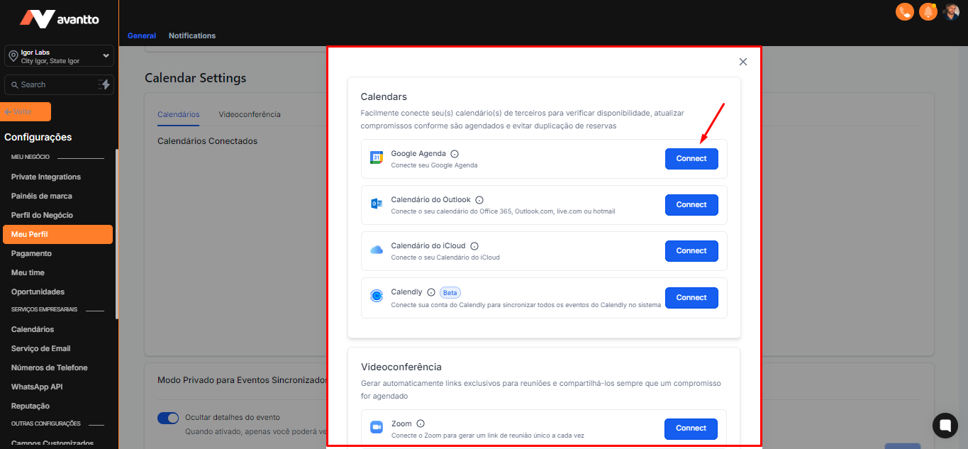 3.2 Com a opção Calendários, você pode conectar facilmente suas agendas, incluindo Google, Outlook, iCloud e Calendly. Além disso, as opções de videoconferência, como Google Meet e Zoom, também estão disponíveis. Essa integração é essencial para quem atua no ambiente digital e necessita gerenciar suas agendas de forma eficiente, gerando links para reuniões automaticamente. Para realizar a integração, basta clicar em Conectar. Após concluir esse processo, a integração estará configurada, permitindo que você utilize o Calendário, Google Meet ou qualquer outra plataforma que escolher conectar.
