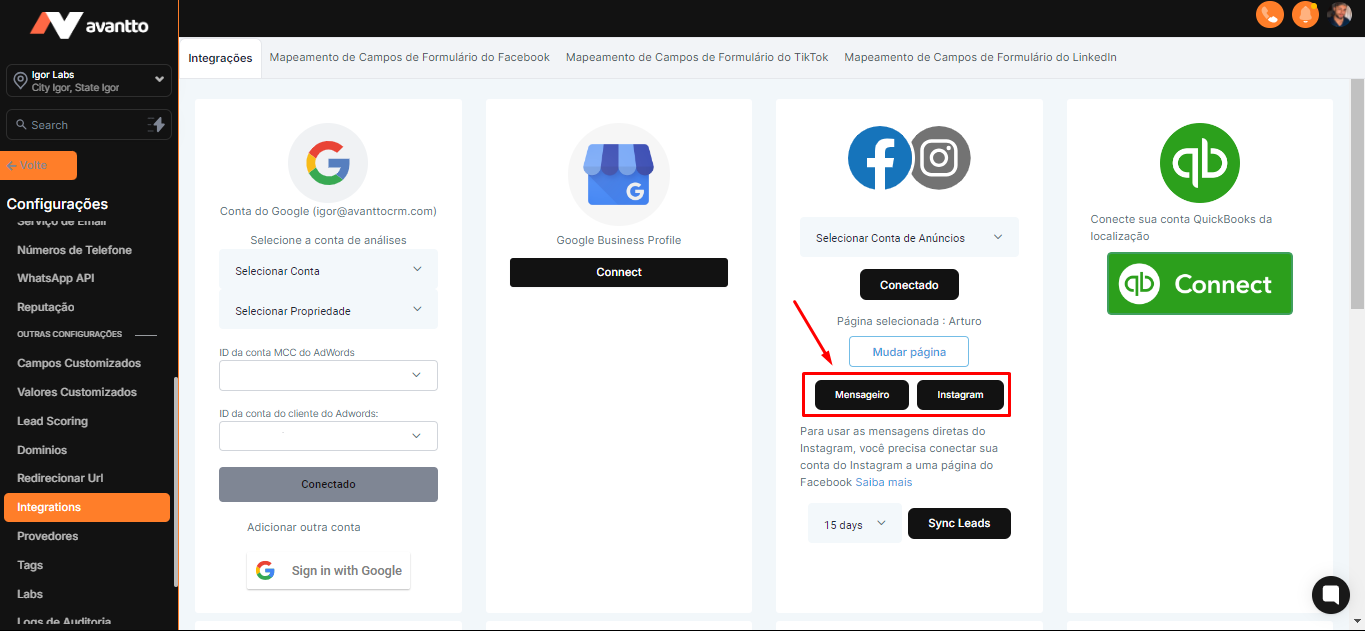 2.2 Para centralizar as mensagens e conversas do Messenger e do Instagram na Avantto, clique na opção Messenger/Instagram. Após clicar em uma das opções, certifique-se de manter esse campo ativo para que todas as mensagens e conversas sejam disponibilizadas na seção Chat.