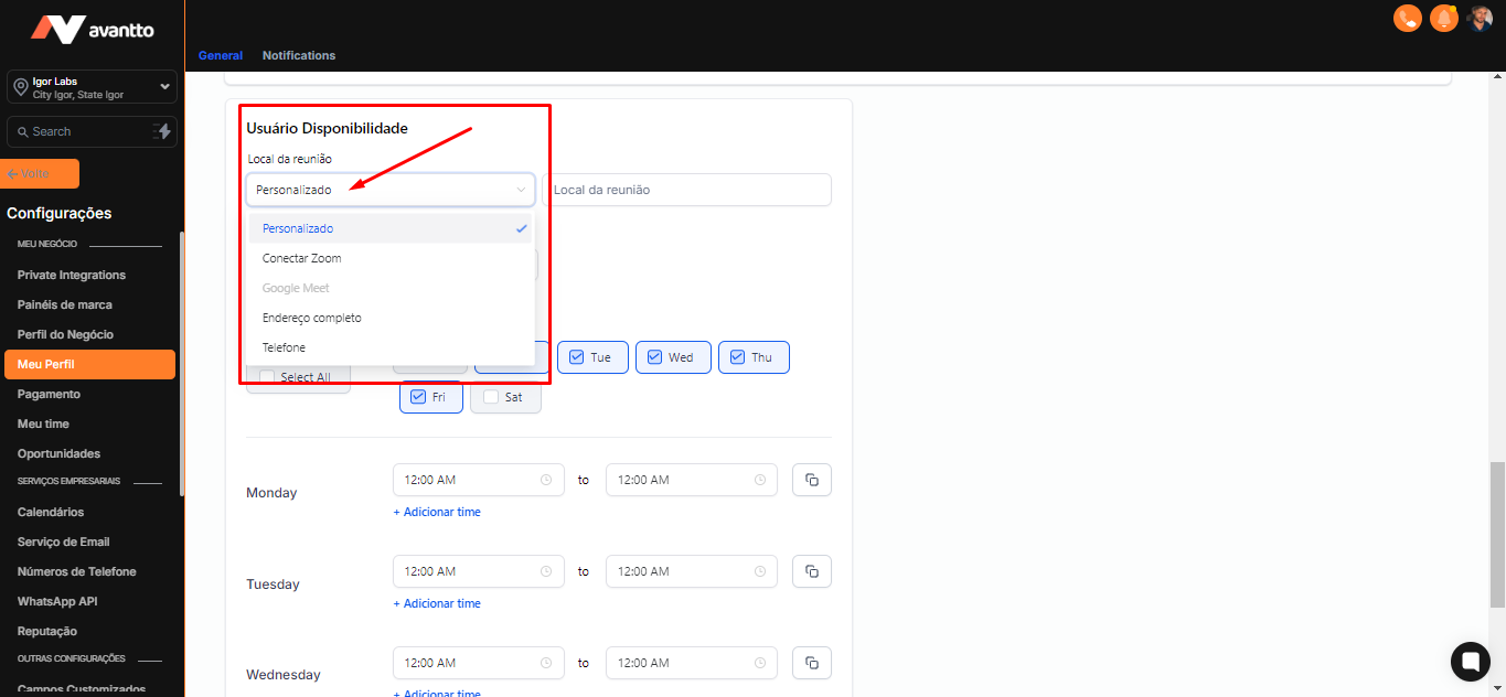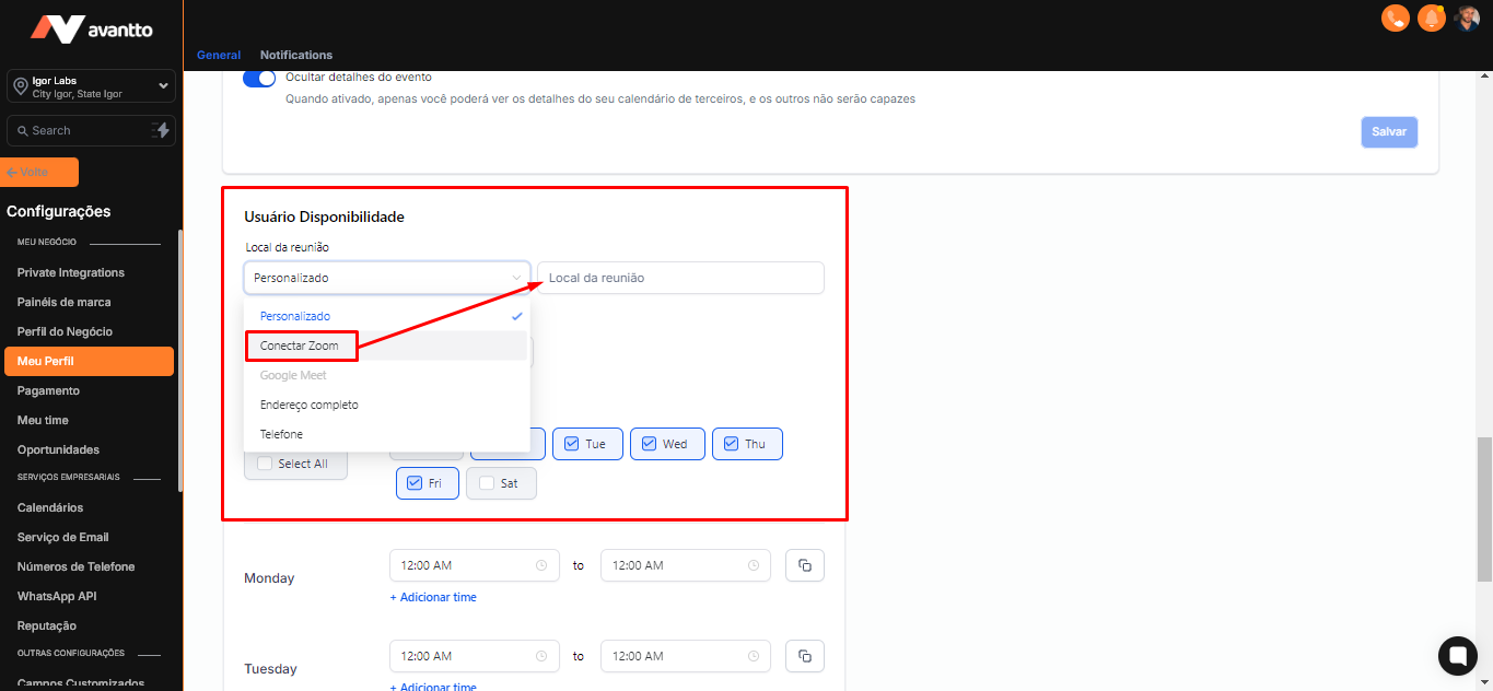 3.3 Para garantir que seu calendário será utilizado nas automações e que os links serão criados de forma automática, role a tela para baixo até a seção Disponibilidade do Usuário. Na opção Local da Reunião, clique em Personalizado para definir onde será gerado o link da sua reunião, escolhendo entre Google Meet ou Zoom, caso você tenha uma reunião online.