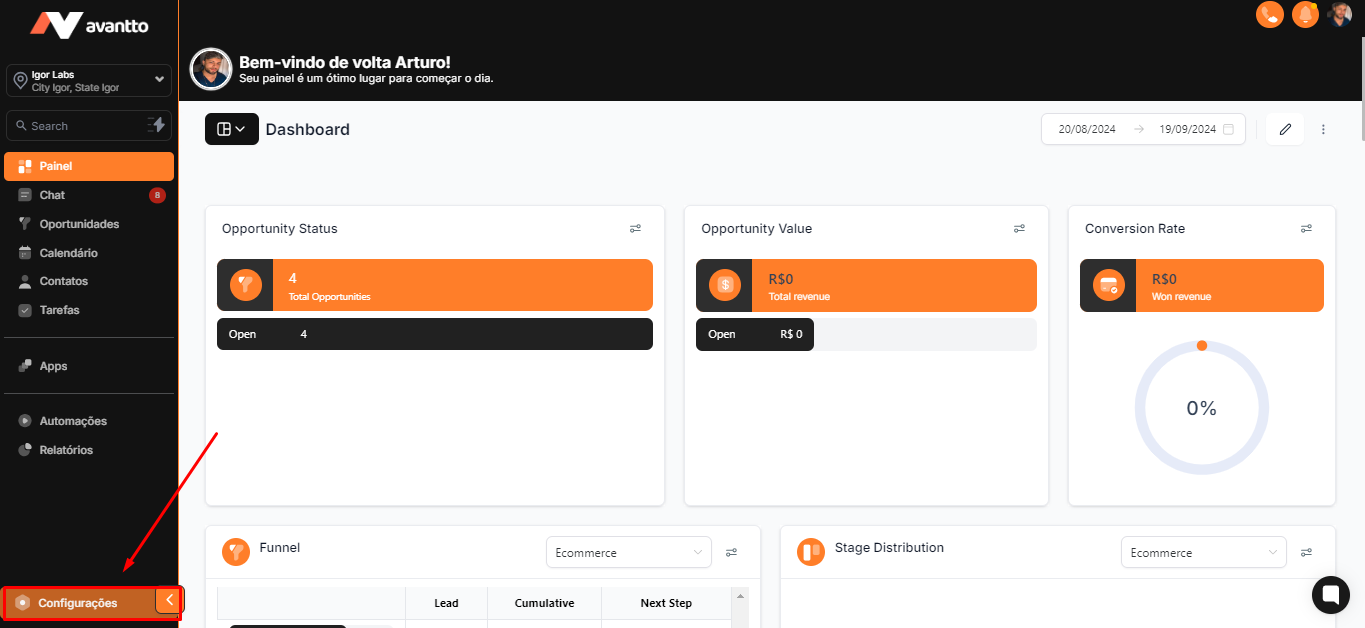 1.1 No menu lateral esquerdo da tela, clique em Configurações