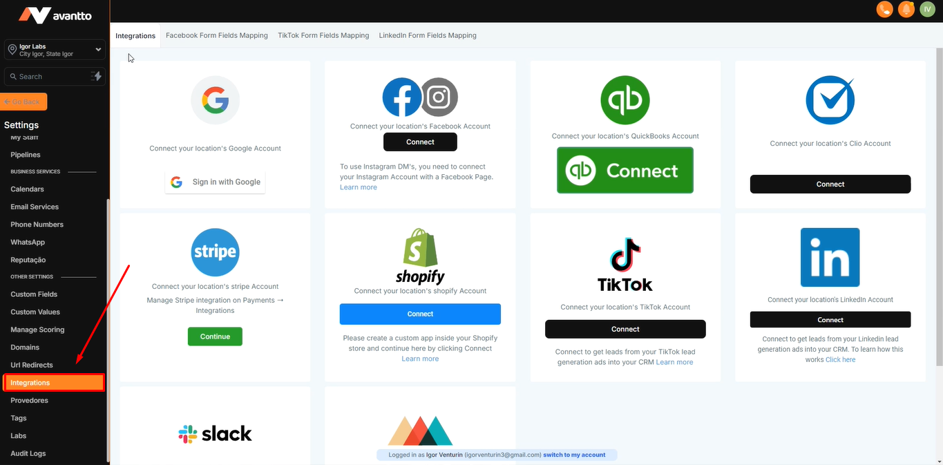 1.2 Role a tela até encontrar a seção Integrações e clique sobre ela para visualizar as principais integrações nativas disponíveis na Avantto. Você encontrará uma ampla variedade de opções, incluindo Google, Facebook, QuickBooks, Shopify, LinkedIn, TikTok, Clio, Stripe, Slack, Printful e Shippo. Por exemplo, ao selecionar Google, você poderá conectar diversas ferramentas, como Google My Business, Google Location e Google Ads, abrangendo praticamente todas as funcionalidades do Google que você deseja integrar.