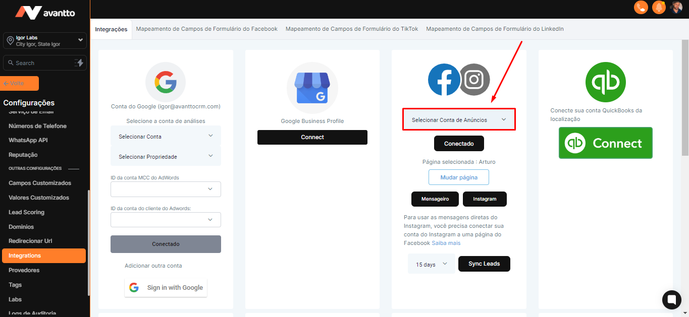 2.1 Ao conectar as contas do Facebook e Instagram, selecione a página que você deseja utilizar. O mesmo pode ser feito com outras ferramentas disponíveis nessa aba, integre com as ferramentas de acordo com a sua necessidade.