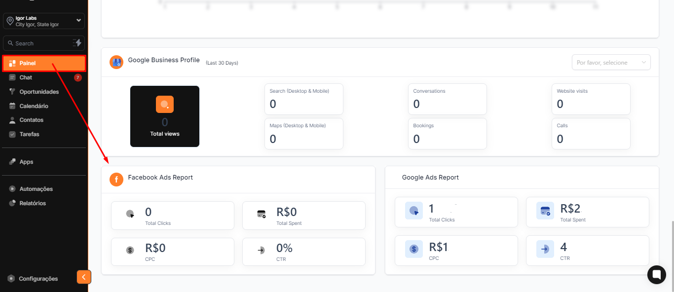 2.3 É essencial realizar todas essas integrações para viabilizar a análise de dados no Painel/Dashboard. Ao rolar a tela para baixo no painel, você encontrará informações relevantes, como, por exemplo, os dados do Facebook Ads.