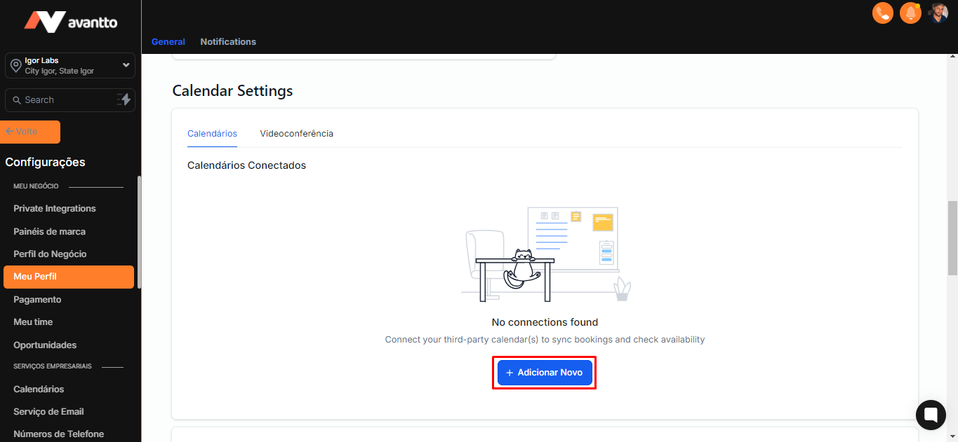 3.1 Ainda no menu Configurações, acesse a opção Meu Perfil e role a tela até encontrar Configurações do Calendário. Neste campo, você terá a possibilidade de adicionar ou integrar seus calendários.