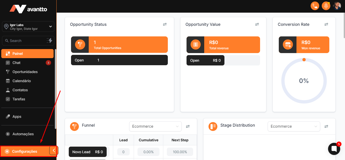1. No menu lateral esquerdo da tela, clique em Configurações.