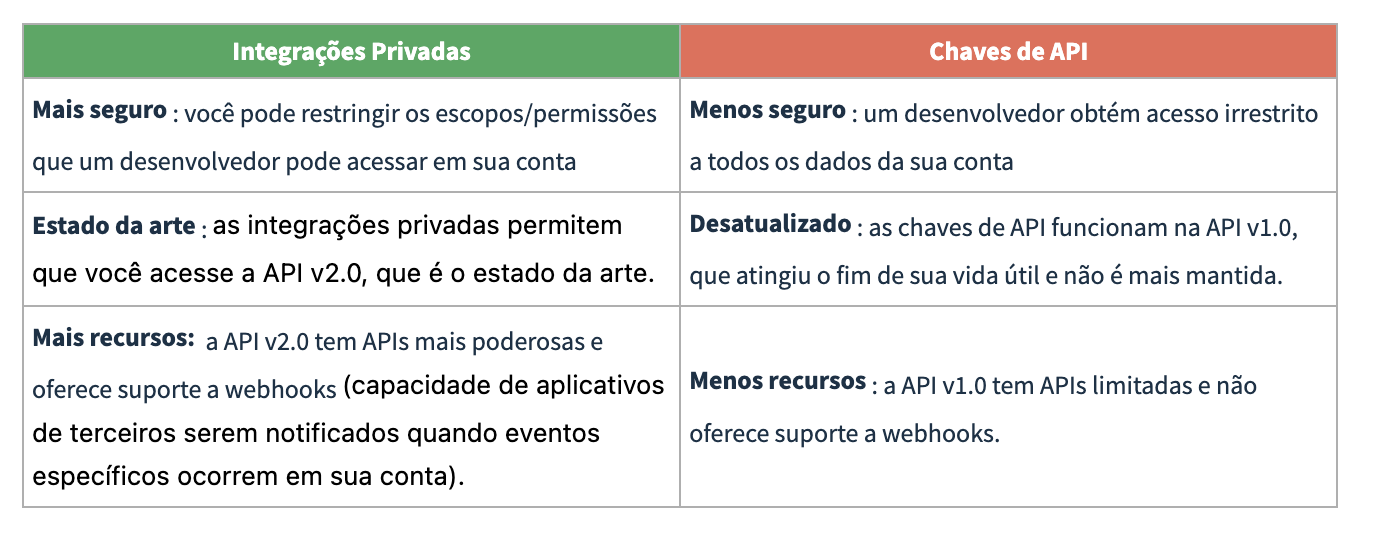 Integrações Privadas, em resumo, são uma alternativa mais poderosa e segura às Chaves de API.