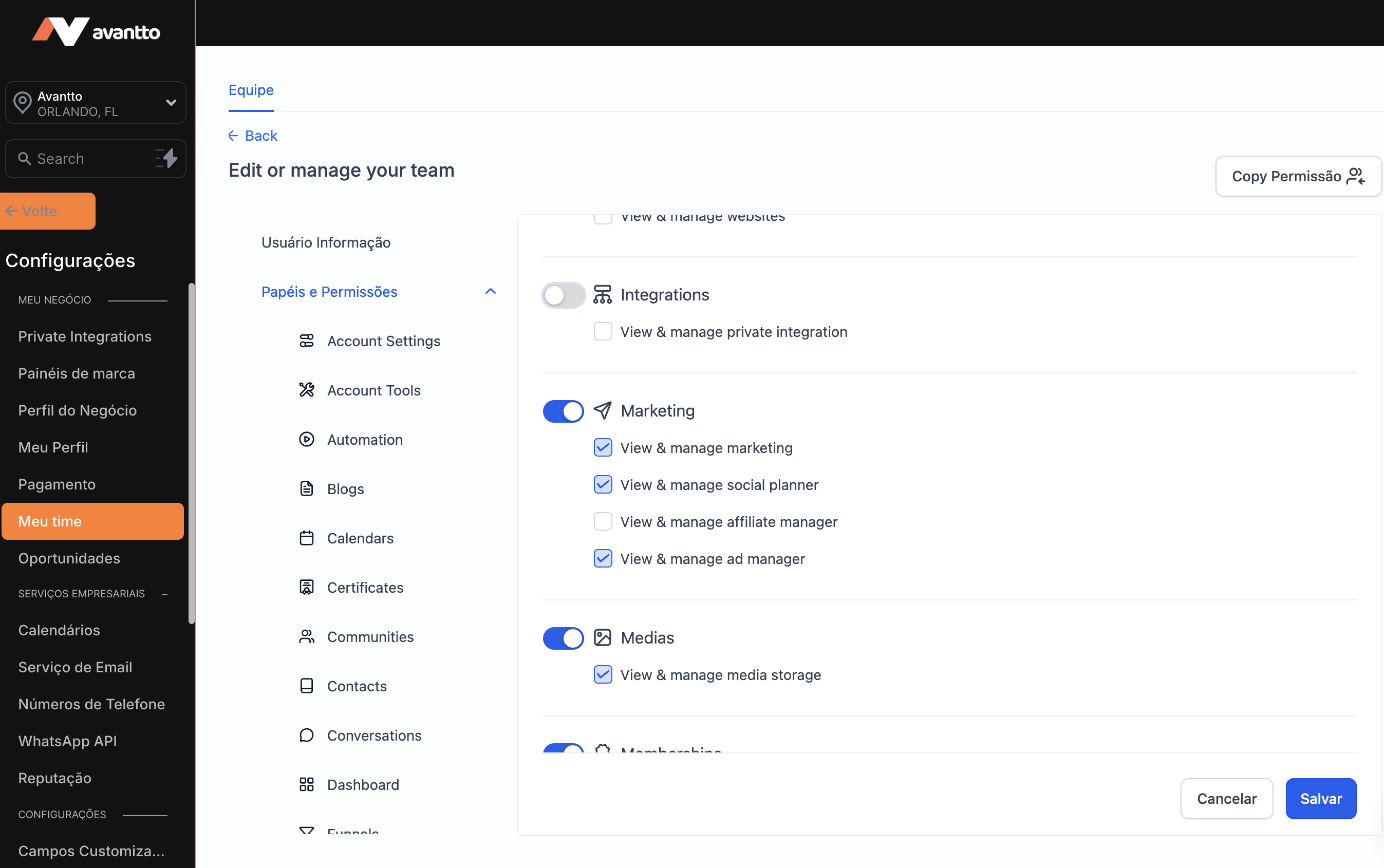 No entanto, você pode restringir essa permissão a nível de usuário. Para fazer isso, navegue até Configurações > Minha Equipe > Edite o usuário específico da conta > Funções e Permissões, e habilite/desabilite Integrações Privadas para o usuário.