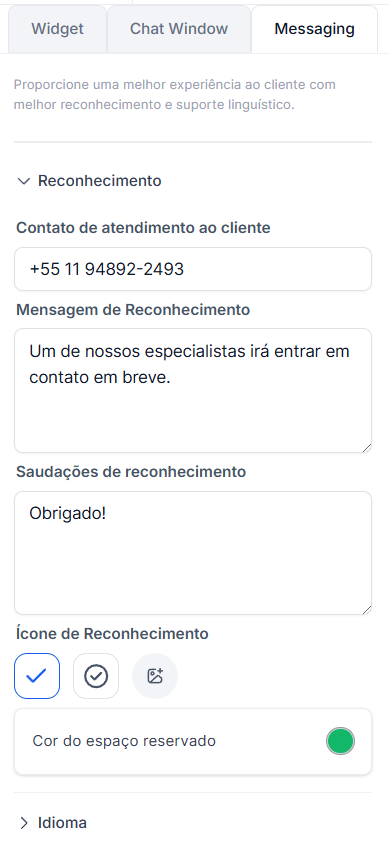 - Mensagens -Aqui o usuário configura o reconhecimento da mensagem e dos ícones. Eles também podem configurar o idioma do widget de chat.
