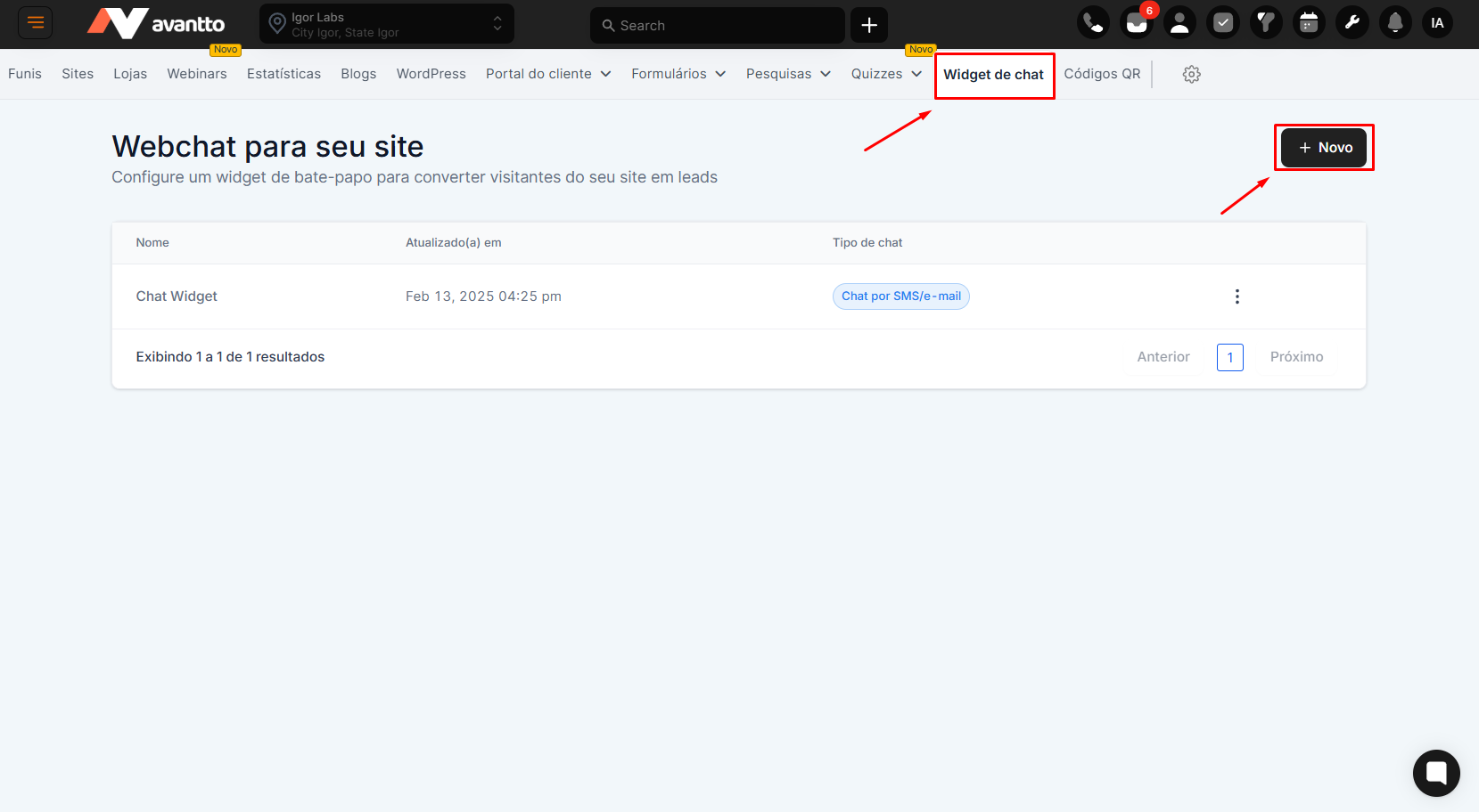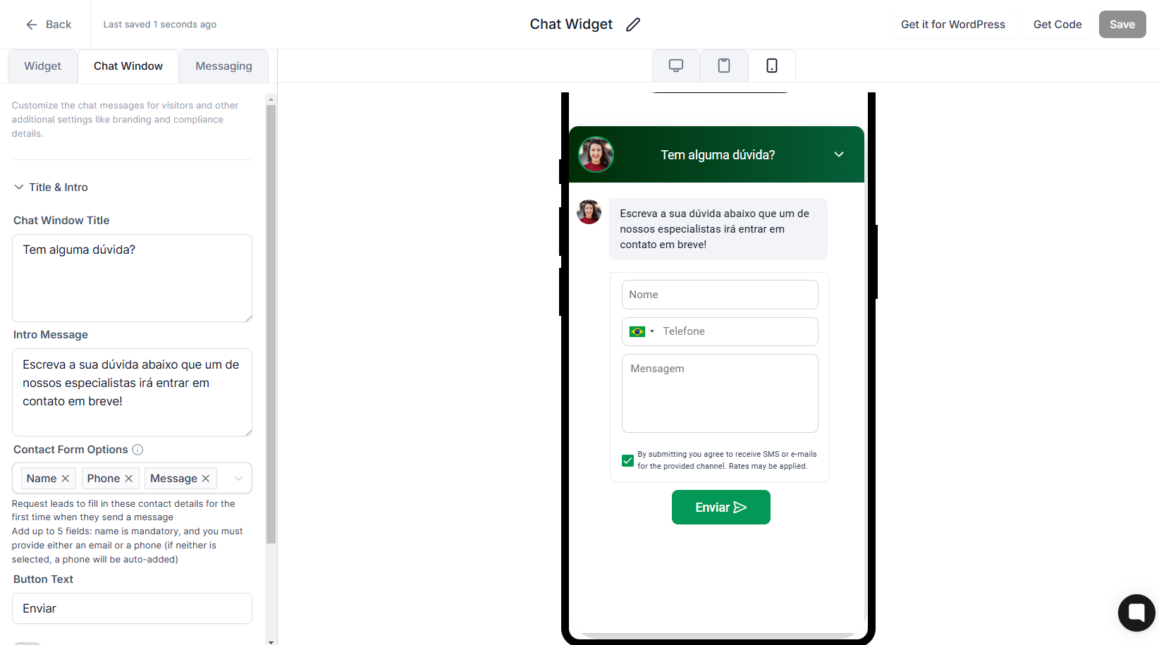 1. Chat com Formulários - Este chat coletará as informações do visitante para que você possa respondê-lo via SMS, WhatsApp ou e-mail posteriormente.