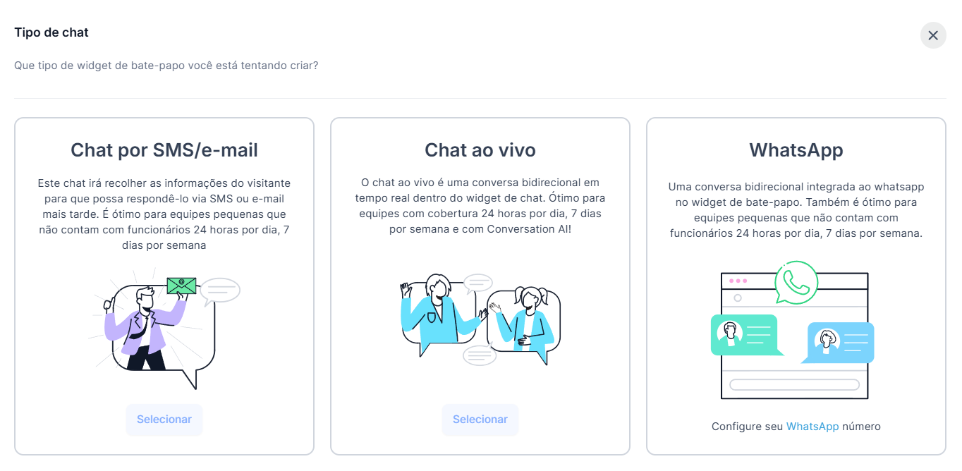 4. Depois de selecionar o tipo de widget de chat, haverá três configurações para implementar o widget de chat.