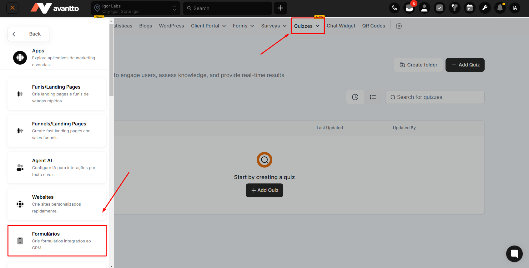 Criar um Novo Quiz: Clique em Criar Quiz e insira um nome.