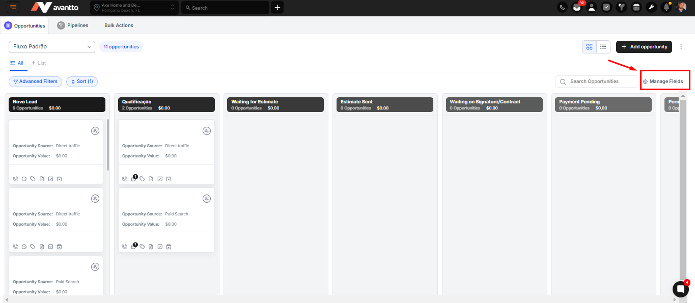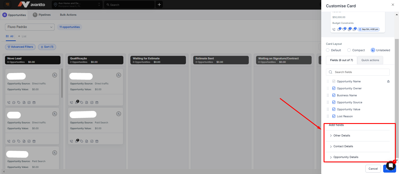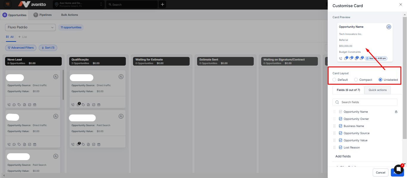 Escolha as informações: Selecione até 7 campos que deseja exibir nos cards.