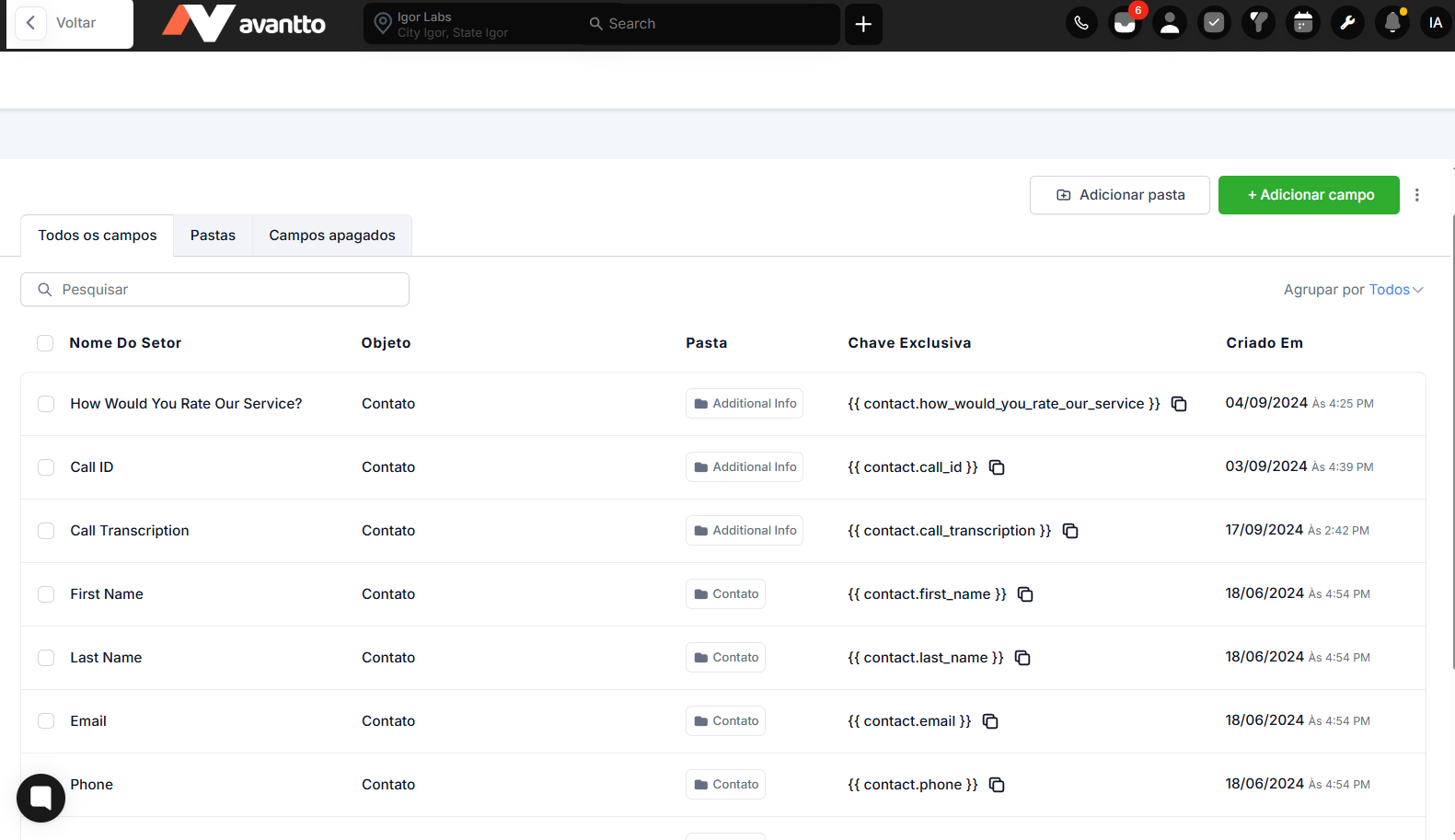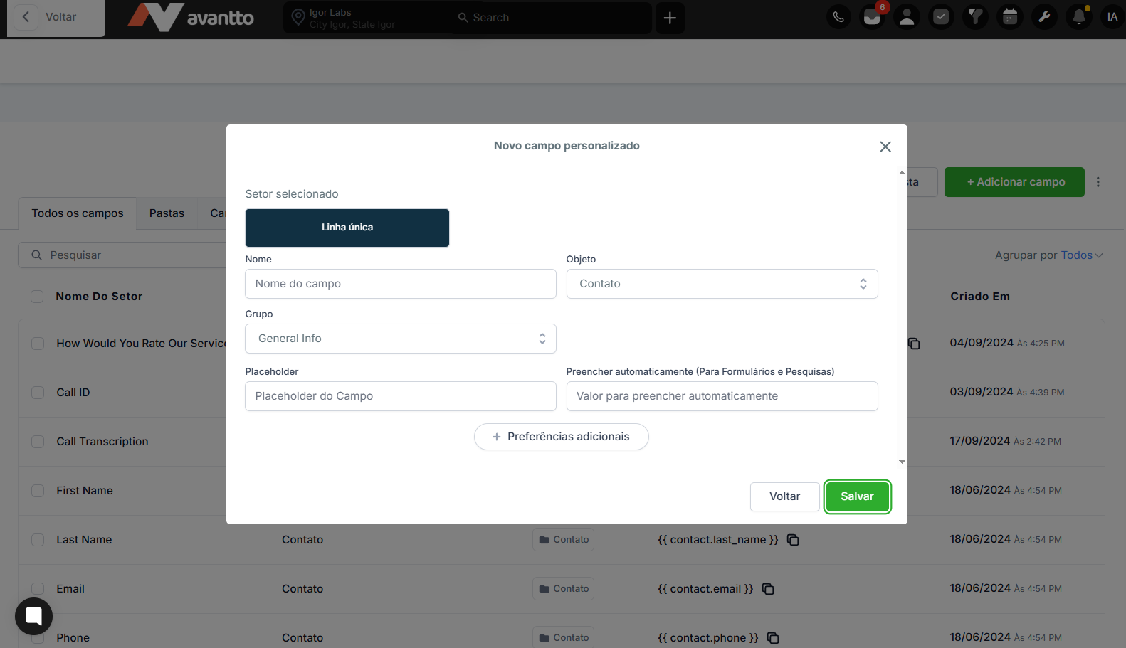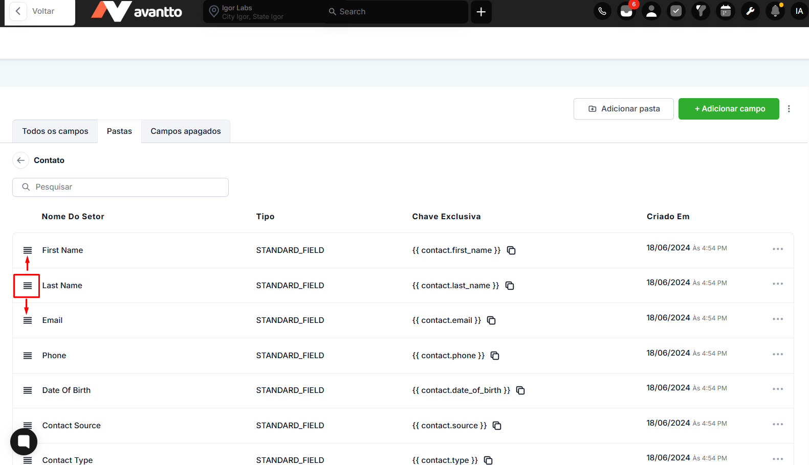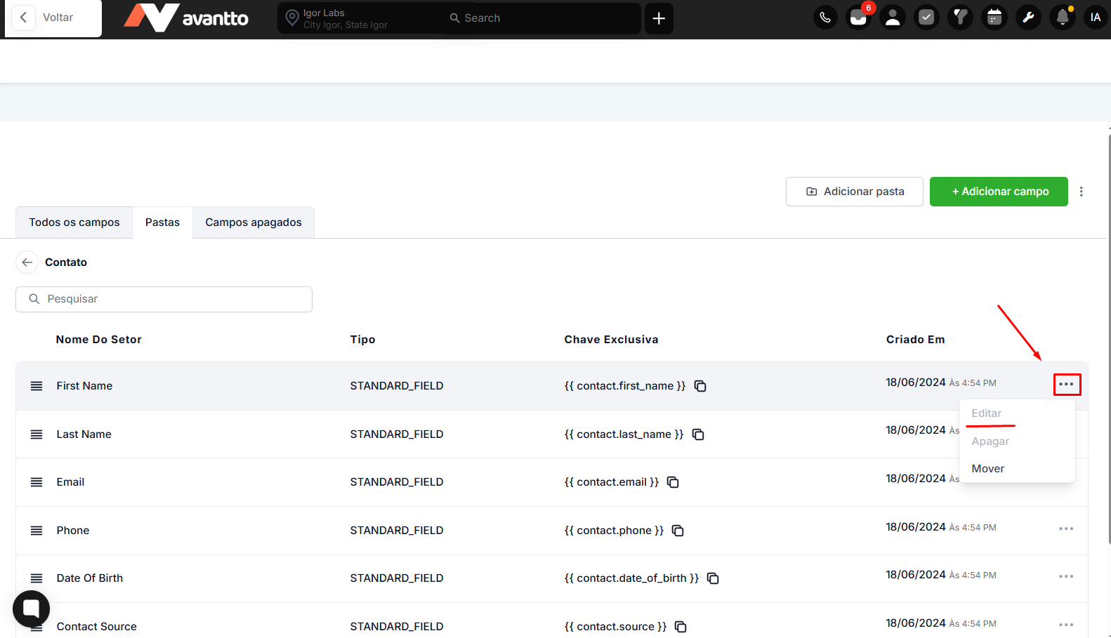Para editar um campo, localize-o dentro da pasta, clique no 3 portinhos ao lado direito dele e ajuste suas propriedades (nome, preferências, grupo, etc.). Note que campos padrão (E-mails, Nomes e etc) não podem ser modificados, apenas reordenados.