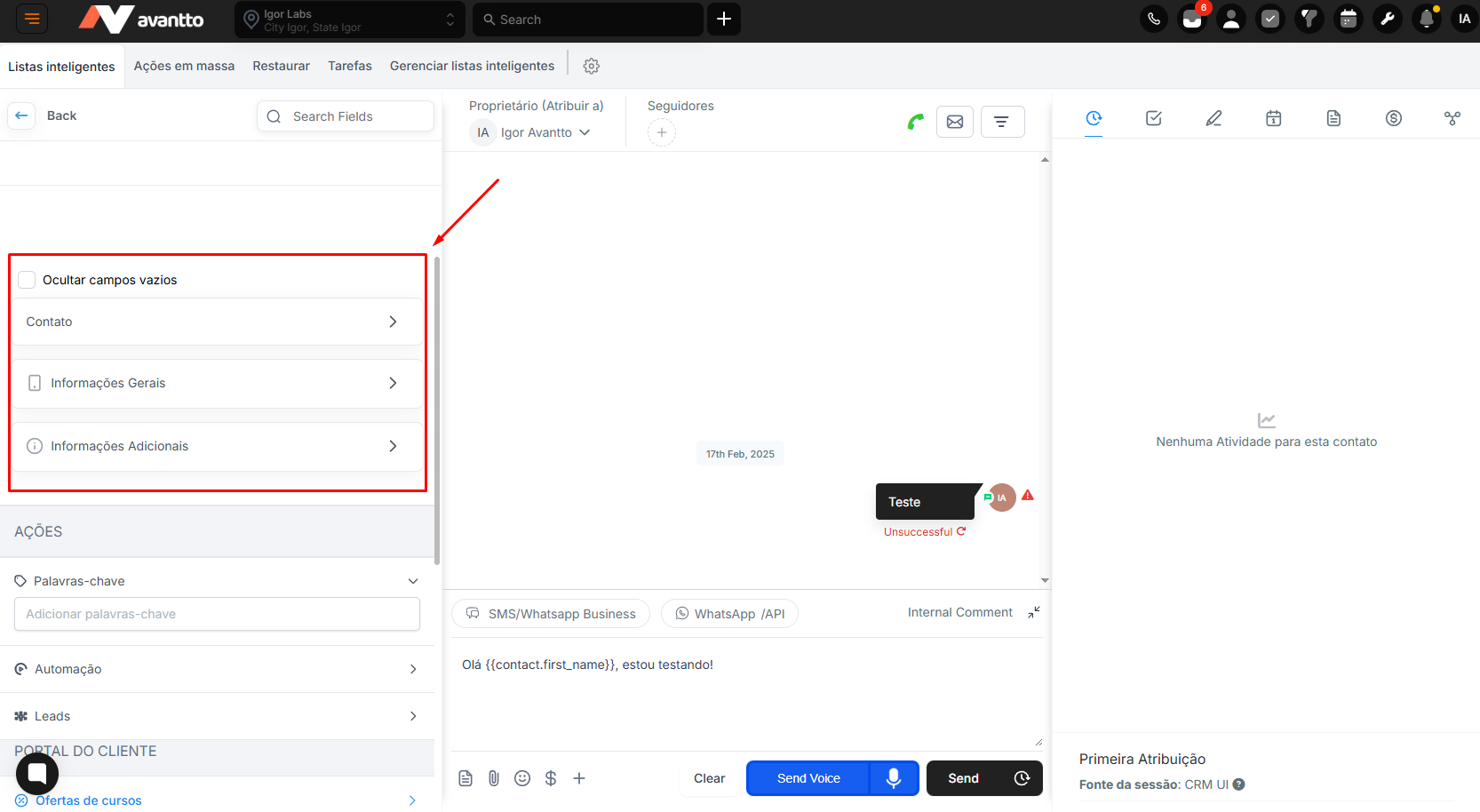 Os campos de Contato ficam localizados ao lado esquerdo dentro da visualização do contato.