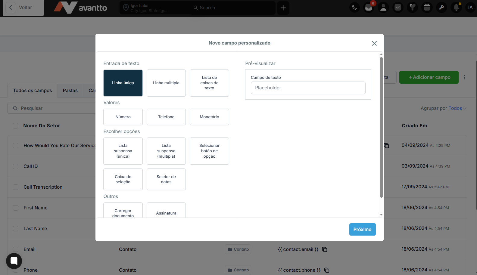 Clique em "Adicionar Campo" e selecione o formato desejado (texto curto, multilinha, numérico, data, drop-down, etc.), ao selecionar será possivel ver uma prévia de como será o campo.