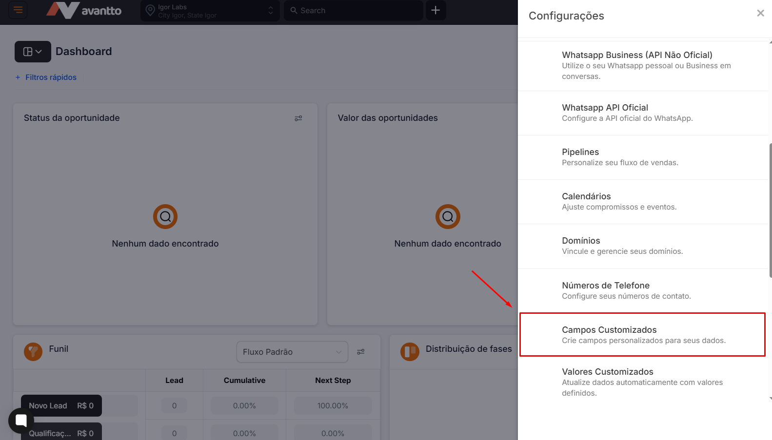 Para visualizar os campos já existentes, clique em "Configurações" e na sequencia em “Campos Customizaveis”. Aqui, você verá todos os campos e poderá interagir com eles (adicionar, ocultar ou reorganizar), além disso também poderá consultar as chaves únicas dos campos para uso em automações ou mensagens personalizadas.